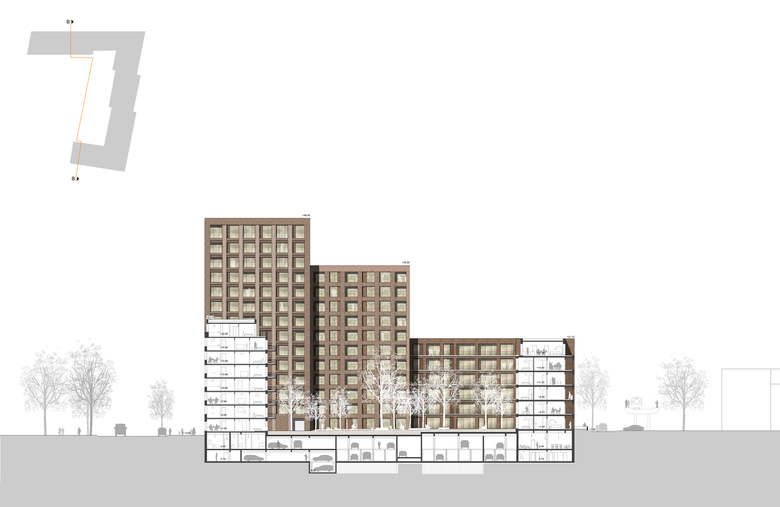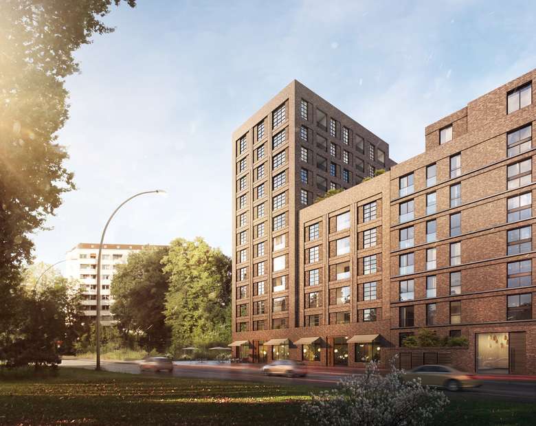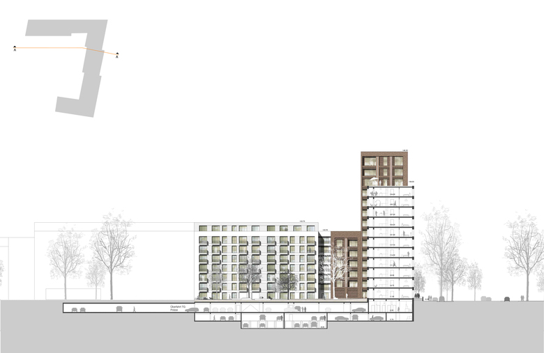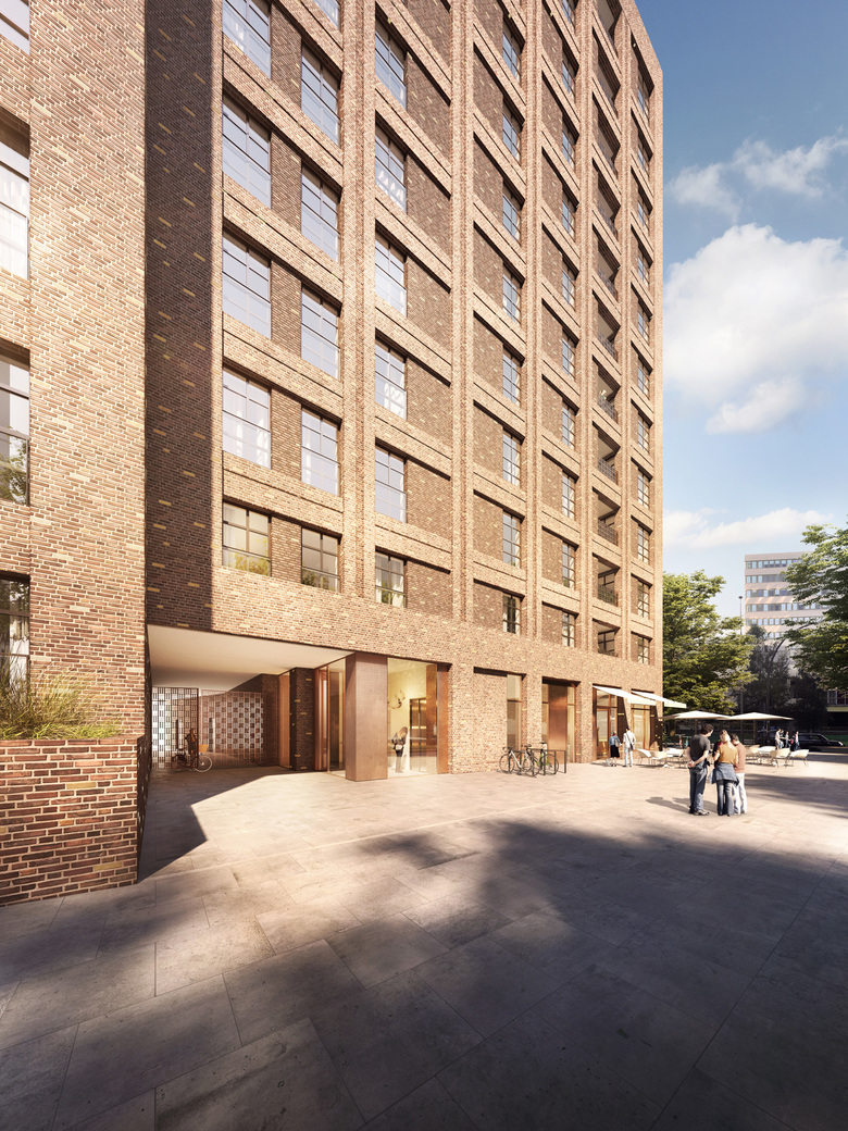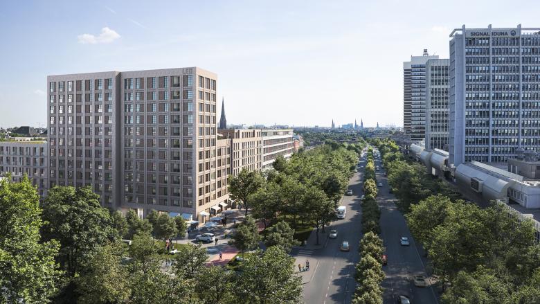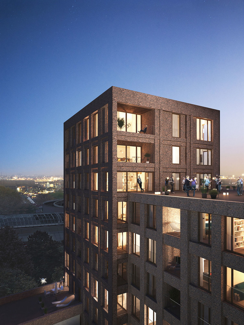 Die 12-geschossigen Hochhäuser nehmen zum einen die Maßstäblichkeit der nördlichen Bebauung an der Oberaltenallee auf, schaffen aber durch ihre Materialität einen harmonischen Übergang in das neue Wohngebiet.