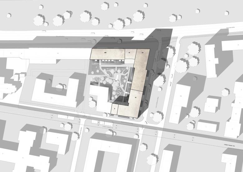 Der gemeinsame Innenhof wird qualitätvoll gestaltet. Im Gegensatz zu der klaren, graden Linienführung des Baukörpers dominiert bei der Freiraumgestaltung eine weiche Wegeführung und Grünfeldeinteilung. Um den zentralen Aufenthaltsbereich in der Mitte des Innenhofes befinden sich aufgelockerte polygonale Inseln mit verschiedenen Funktionen, wie Spiel-, Rasen- oder Pflanzflächen.