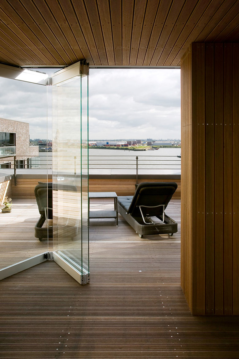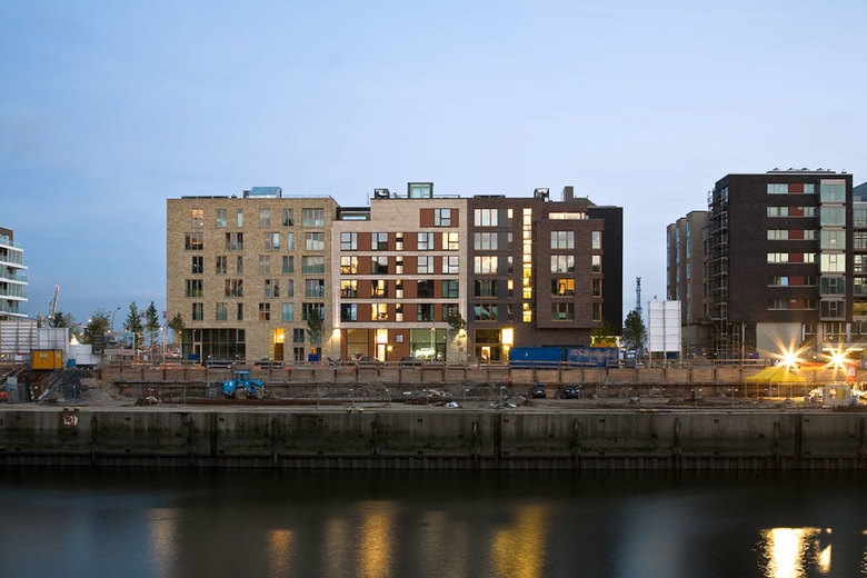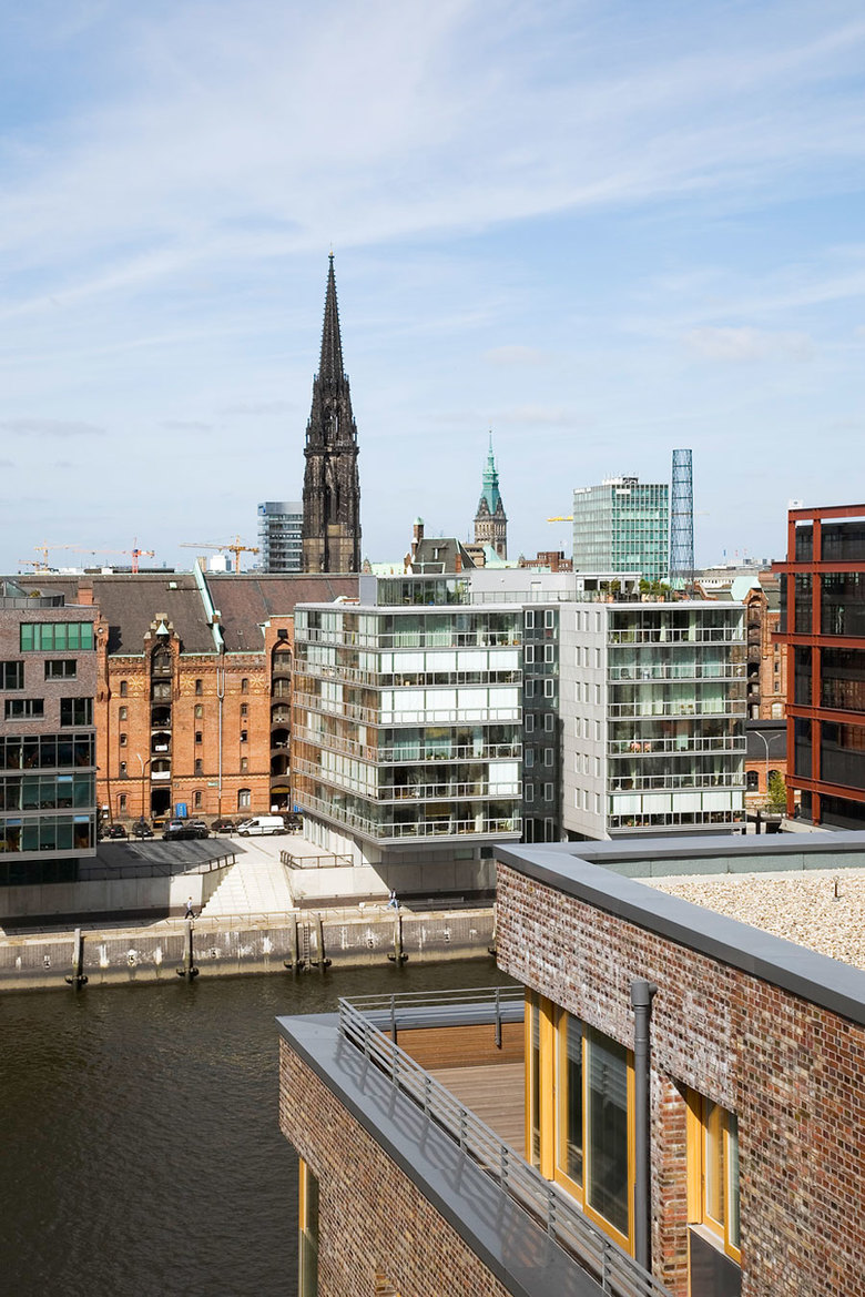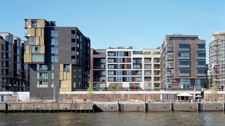 Am Kaiserkai 23-33 realisierten fünf Hamburger Wohnungsbau-Genossenschaften und die Viterra Development zusammen eine winkelförmige Baustruktur mit höchstem Wohngenuß an der Elbe. Ansatzpunkt des Entwurfs ist die Beschäftigung mit dem Thema „urbanes Wohnen“ und die Auseinandersetzung mit der historischen Typologie des Städtischen Reihenhauses. Davon abgeleitet entstanden sechs Häuser die in ihrer äußeren Erscheinung eine ausgeprägte Individualität aufweisen und ihre jeweiligen Besonderheiten unterstreichen. Unterschiedliche architektonische Handschriften entwickeln individuelle Häuser, lassen diese dann durch Maßstab, Materialaussage und Textur zu einer Familie verschmelzen. Es entsteht ein breit gefächertes Wohnungsangebot mit anspruchsvollen Grundrissen, durchdachter Innenraumgestaltung, großzügigen Loggien und Dachterrassen mit reizvollen Ausblicken. Der Hof versteht sich als Wohnhof, Wohnnutzungen auch im Erdgeschoss unterstützen dies.