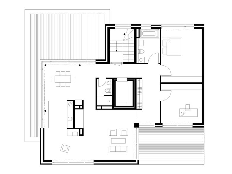 Zur Straße „Am Kaiserkai“ und zum Quartiers-Platz sind kleinere Gewerbeeinheiten und die Hauszugänge angeordnet. In Anlehnung an die Aussenanlagengestaltung von EMBT werden die Gebäudeköpfe im Bereich des Warftsockels freigestellt. Treppen, Rampen, Holzdecks und eingestellte Bauminseln mit Sitzmöglichkeit ergeben eine spielerische Innenhofgestaltung. Sitzen, schauen, treffen, spielen, kaffeetrinken, skaten, sonnen und schiffegucken; das Quartier am Kaiserkai ist ein Ort mit besonderer Aufenthalts- und Wohnqualität.