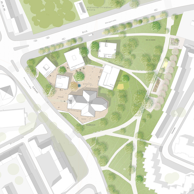 Das Haus für die Kinder und für die erweiterten Ersatzwohnungen bildet den östlichen Abschluss des Ensembles und wird entsprechend der Sichtbeziehung von der Königstraße zum Nordportal der Kirche weiter in den Grünzug positioniert. Die Freiflächen für die Kinder bilden weiterhin den Übergang zum Grünzug.