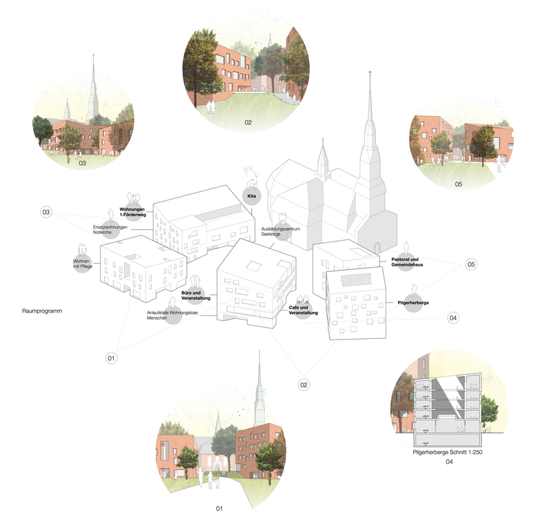 Die Kirche mit ihren Schmuckelementen und der lebhaften Ziegelmaterialität bildet den eindeutigen Hauptpunkt. Die neuen kubischen Baukörper entsprechen einer eher archaischen Grundform (Haus mit Dach) und treten nicht in Konkurrenz zur Kirche. Über das Material roter Ziegel wird die Zusammengehörigkeit betont.