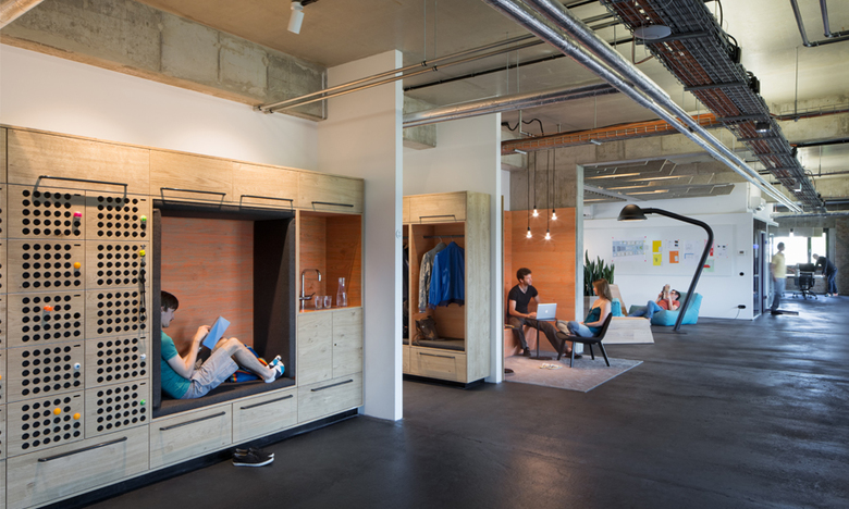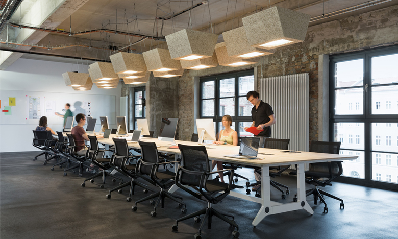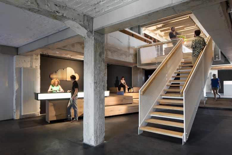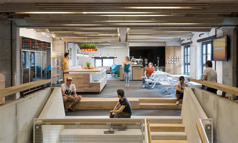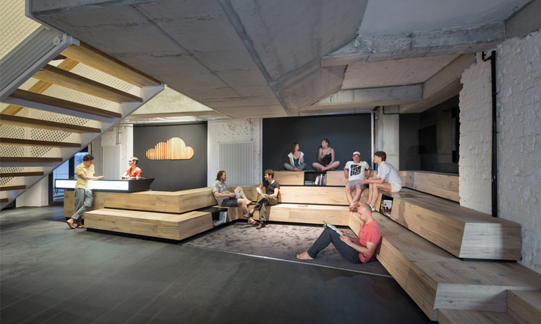 The new headquarters of internationally renowned online platform SoundCloud cover three levels of an old brewery building close to the former Berlin Wall. The complex, designed to serve as a future incubator for up-and-coming start-ups, will become the one-stop office for all 180 Berlin employees of the foremost hub for musical exchange on the net. Anticipating future expansion of the rapidly growing SoundCloud platform, the spacious offices could potentially accommodate up to 350 desks. To provide the company and its new HQ with a matching spatial identity, SoundCloud asked Kinzo to turn its new hub into a space that exudes and encourages innovation and creativity. Against this background, Kinzo’s conversion redefines the rules of office design with its tangible reflection of a virtual community.