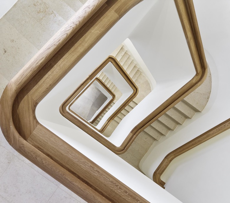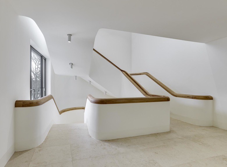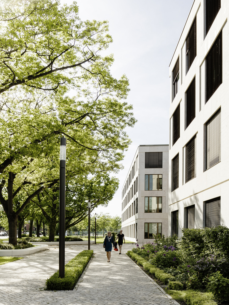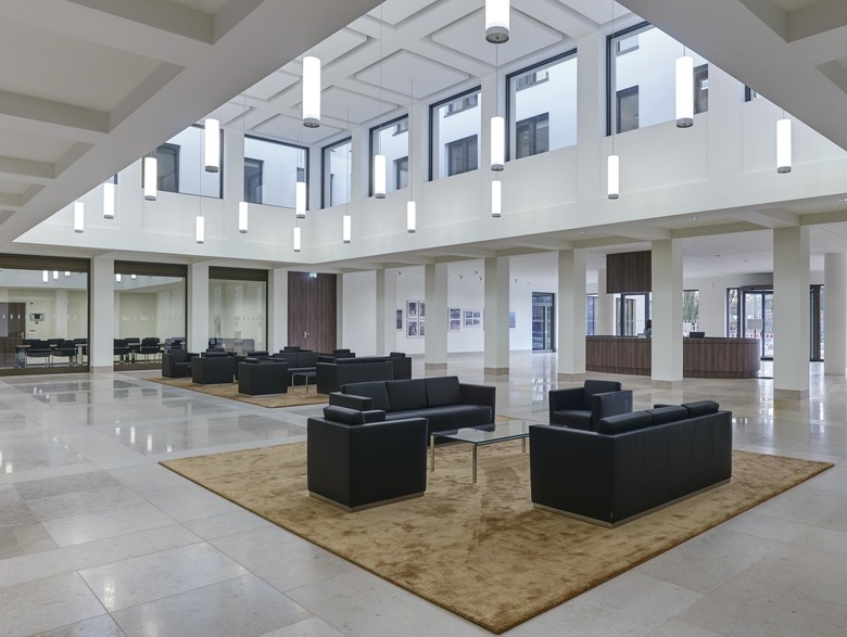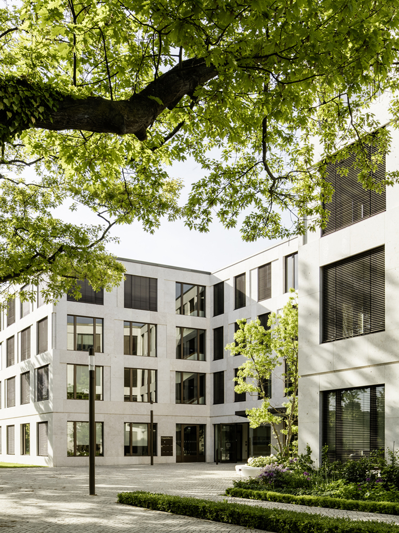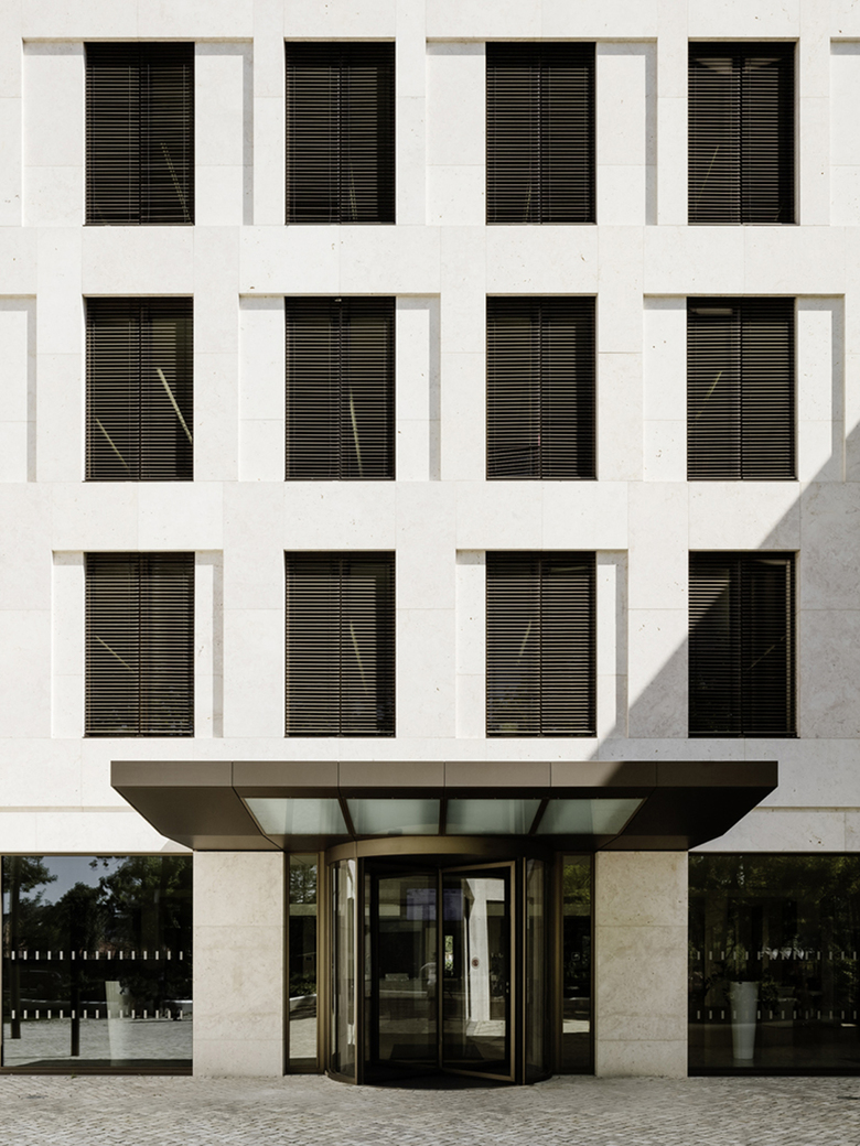 The new office and administration building for the Kassenärztliche Vereinigung Brandenburg and the Landesärztekammer Brandenburg was developed on a building site along Pappelallee in Potsdam. The structure encompasses the Georg-Herrmann-Allee, where the street-facing façade is aligned with the adjoining development to the north. Conceived as a freestanding solitaire, the building is embedded in a park-like environment with mature trees. The structure conveys a monolithic impression through two enclosed courtyards and an entrance plaza that opens to the street. A conference area on the ground floor surrounds a central, two-storey hall, which is lit by a large ‘roof lantern’. Staff can access the office levels through a centrally located main entrance and staircase without interrupting conferences or meetings. Ceiling height and window openings extending over two or three expansion grids create a broad façade that reflects an open and modern management style. The bright shell limestone used for the façade brings to mind the spirit of traditional Potsdam architecture. A quasi-abstract branch tracery design can be followed through each storey along the surfaces of the pillars, varying in intensity from front to back and creating a gradual transition from light to heavy. Following this logic to its inevitable conclusion, the basement level has been completed in a flat design and offset from the upper storeys by a shadow gap.