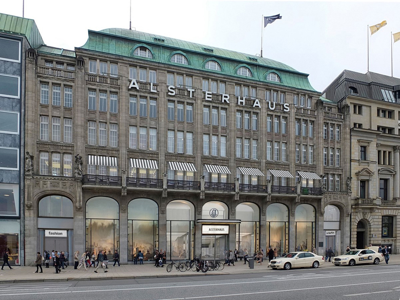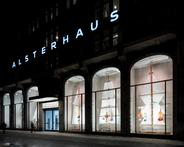 1912 wurde das Alsterhaus im Zentrum Hamburgs an der Binnenalster errichtet und seitdem mehrfach umgebaut. Die bauliche Qualität des Hauses wird zum Thema gemacht, in dem die unter Denkmalschutz stehende Kaufhausfassade von den nicht denkmalgerechten Veränderungen befreit wird und im Inneren eine nunmehr einheitliche und übergeordnete Gestaltung zum Tragen kommt. Die Balkone im zweiten Obergeschoss werden künftig für ein großzügiges Café mit Blick auf die Binnenalster genutzt. Zusammen mit der neuen Fassaden-Illumination entsteht ein harmonisches Gesamtbild, das in die Stadt ausstrahlt. Nach historischem Vorbild rückt der Eingang am Jungfernstieg wieder in die Mittelachse. Die klare Wegeführung im Inneren ermöglicht eine bessere Übersicht für die Besucher. Auch der Eingang an der Poststraße wird von der Ecke in die entlang des Boulevards laufende Fassadenflucht verlegt. Die Besucher können somit auf geradem Weg zum anschließenden Luxus-Boulevard durch das Haus flanieren. Der architektonische Raum wird gefasst durch profilierte Decken und Wände. Hinter dem neu gestalteten Eingang am Jungfernstieg erwartet die Besucherinnen und Besucher eine eindrucksvolle zweigeschossige Halle gleich eines Stadtplatzes, die sogenannte Luxury-Hall. Sie bildet den Auftakt zum groß angelegten Luxus-Boulevard, der die Eingänge an den Straßenseiten Jungfernstieg und Poststraße miteinander verbindet. Mit der Reduzierung der Rolltreppenanzahl von vier auf zwei wird die Aufenthaltsqualität weiter gesteigert. Dem Kunden eröffnet sich dadurch ein besserer Überblick und ein großzügigeres Raum- und Einkaufserlebnis. Das Gestaltungskonzept aus Terrazzo und Werkstein folgt einer Grundhaltung, die perfekt zu Hamburg und der baulichen Historie des Hauses passt.