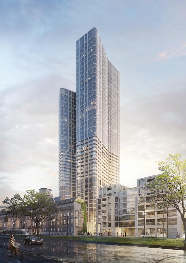 Die Präsidiumstürme öffnen ihre Flügel mit einladender Geste zur Friedrich-Ebert-Anlage. Ihre schlanke, elegante Gestalt basiert auf der Gliederung des Volumens in einen hohen Turm mit größerer Grundfläche und einen kleineren, niedrigeren Turm. Leicht geknickte Flügelkanten verkürzen optisch die Fassadenlängen und lassen ein schönes Schattenspiel entstehen. Die stark skulpturale Wirkung der Türme wird durch die gerundeten Gebäudeecken verstärkt. Die Fassadengestaltung lässt in ihrer Selbstverständlichkeit der expressiven Skulptur der Gebäudeform den Vorrang.