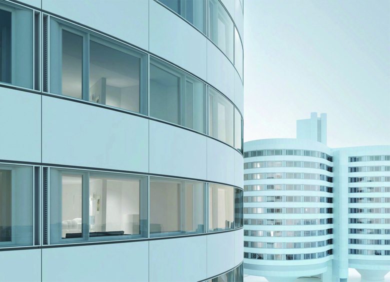 Durch die formale Reduktion und Konzentration auf die exakte Ausformulierung der wenigen Fassadenbestandteile entsteht ein Bild von Eleganz und Feinheit, das – unterstützt durch die Materialwahl von poliertem Aluminium und hochweißem Glasfaserbeton – medizinische Präzision vermittelt.