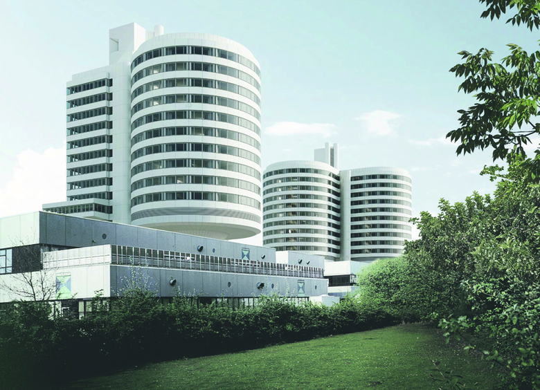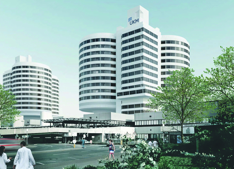 Die Bettentürme sind ein fester Bestandteil der Münsteraner Skyline und zugleich Wahrzeichen des Universitätsklinikums. Aus diesem Grund soll die optische Identität der Bettentürme erhalten werden und lediglich energetisch und gestalterisch im Sinne ihrer ursprünglichen Entwurfsidee unserer Zeit angepasst werden. Die vertikale Gliederung des Bürotraktes hingegen soll zukünftig die horizontale Bänderung der Bettentürme aufgreifen. Auf diese Weise wird der formale Zusammenhang zum Sockelbaukörper gewahrt und ein formal wahrnehmbarer Gesamtkomplex geschaffen.