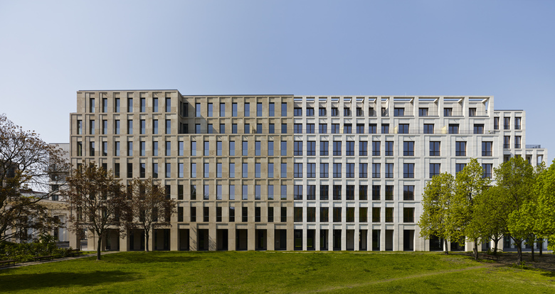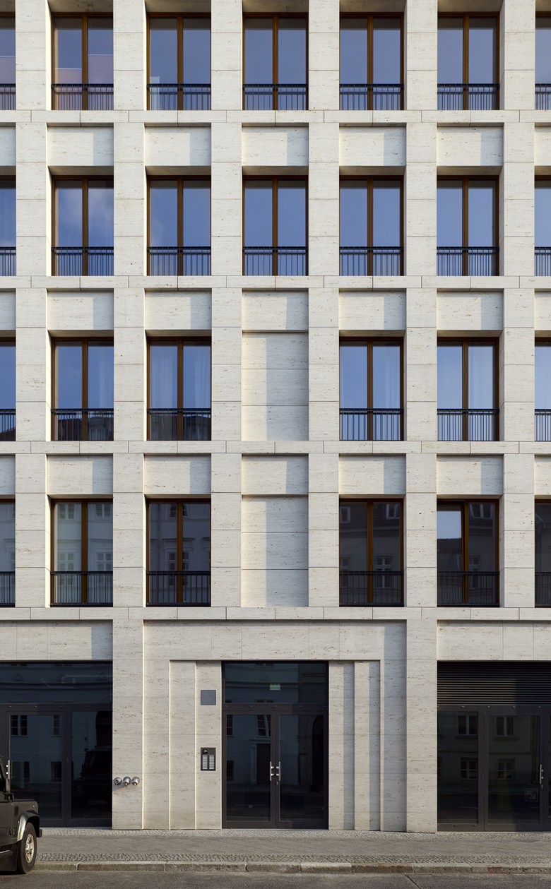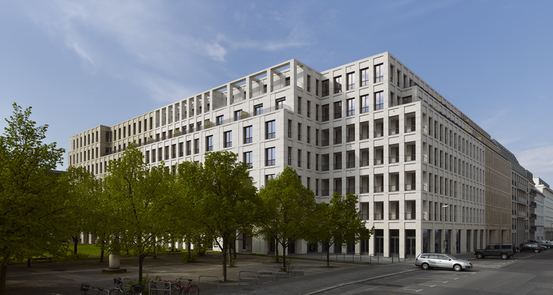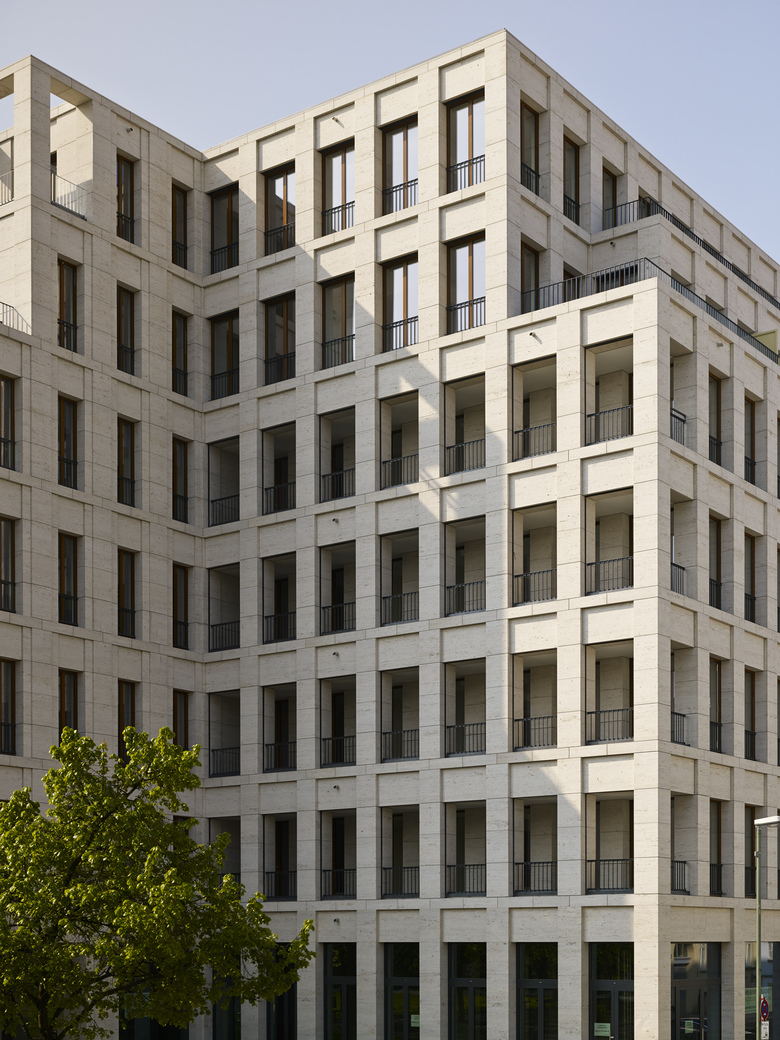 Some may experience the building on Max-Reinhardt-Platz as a coherent complex with a unifying design; others may perceive the individual construction elements as separate buildings. This is achieved through the individual design of the façade, wherein single building elements represent the variations in the underlying theme shared by the entire structure. By adjusting its height to the adjacent buildings, the scale of the surroundings that have emerged over the years is taken into account. The building houses contain a mixture of commercial and residential elements typical of Berlin. A shopping area on the ground floor enlivens the square, while the corner facing the ‘Deutsches Theater’ has been set aside for a café and terrace. The entrance lobby of the office building opens onto Reinhardtstrasse. A conference area located on the entrance level maintains its public character through its connection to a landscaped inner court. Offices ring the upper floors, and the deeper building sections contain multi-use areas for implementing modern office concepts. Both the office building and the flats have direct access to a shared underground car park.