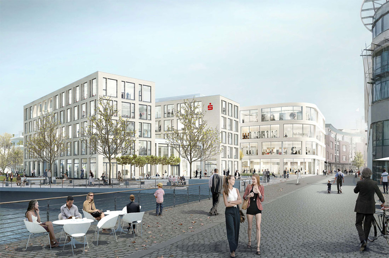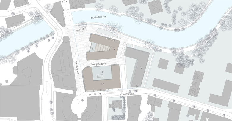 Der Entwurf sieht eine Bebauung mit drei solitären Baukörpern vor. Diese – sich in unterschiedliche Richtungen öffnenden, U-förmigen Bausteine – leiten von der innerstädtischen Blockstruktur in die offene Bauweise des Entwicklungsgebietes über. Durch eine großzügige Aufweitung der Neustraße im Bereich der Aa-Brücke entsteht vor dem Sparkassensolitär eine großzügige Platzsituation, die eine hohe Aufenthaltsqualität bietet. Die neue Hauptstelle öffnet sich zu diesem Platz und positioniert die Sparkasse prägnant im öffentlichen Raum. Die Kundenhalle mit dem Haupteingang wie auch das Verbundcenter sind so exponiert präsentiert. Im südlichen, fünfgeschossigen Baustein sind zwei Einzelhandelsflächen und Dienstleistungsflächen in den darüber liegenden Geschossen vorgesehen. Die Wohnbebauung bildet den östlichen Baustein und Abschluss des Quartiers, das Erdgeschoss ist Dienstleistungsflächen vorbehalten.