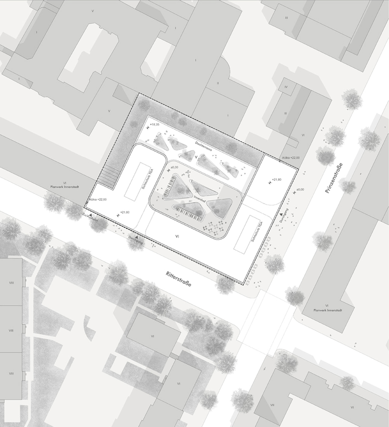 Der Ausdruck des neuen Gebäudes entsteht im Wesentlichen aus der Wahl des Materials – einem hellroten Klinker -, aus einer plastisch gegliederten Fassade, sowie aus den großzügigen Fensteröffnungen, die eine optimale Belichtung der Innenräume gewährleisten. Insgesamt entsteht das Bild eines in sich ruhenden kraftvollen Baukörpers, der sich trotz einer zurückhaltenden, sachlichen Architektursprache im städtischen Kontext behauptet. Mit dem Konzept wird konsequent das Ziel verfolgt, einen öffentlichen Raum in Form eines großzügig dimensionierten Innenhofes zu schaffen.