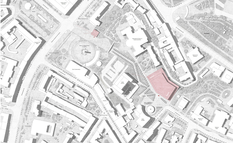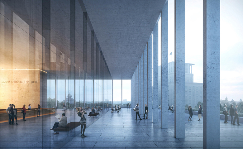 Der für das Museum vorgesehene Ort, gelegen auf einer Anhöhe, gilt als einer der zentralen Orte der „Revolution der Würde“. Der Entwurf für das neue Museumsgebäude auf der Kuppe des Hügels symbolisiert den entscheidenden Moment des Ansturms und transportiert dieses Bild in das Konzept für ein „begehbares Haus“. Gleichzeitig werden dem Nationaldenkmal, welches als Abfolge differenzierter Räume entlang eines gekurvten Pfades angelegt ist, weitere Sequenzen hinzugefügt. Unterschiedlich breite Rampen sind um das Gebäude herum organisiert und zeichnen die Hügelerstürmung in konzentrierter Form nach. Gleichzeitig setzen sie den Weg vom Maidan herauf am Gebäude fort. Dieser mündet von beiden Seiten her in einer Terrasse, welche wiederum einen (reflektierenden) Blick zurück zum Maidan bietet.