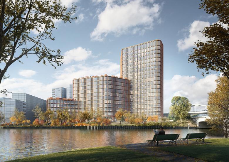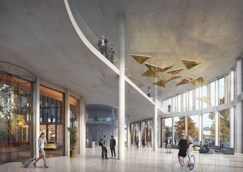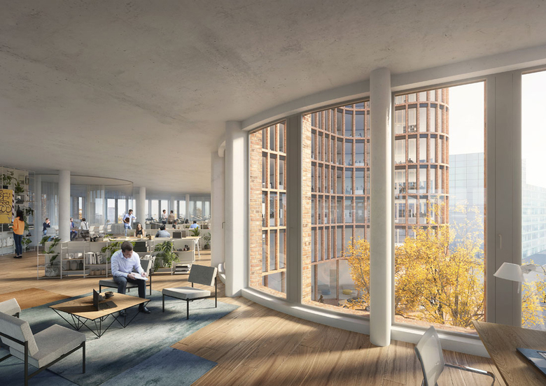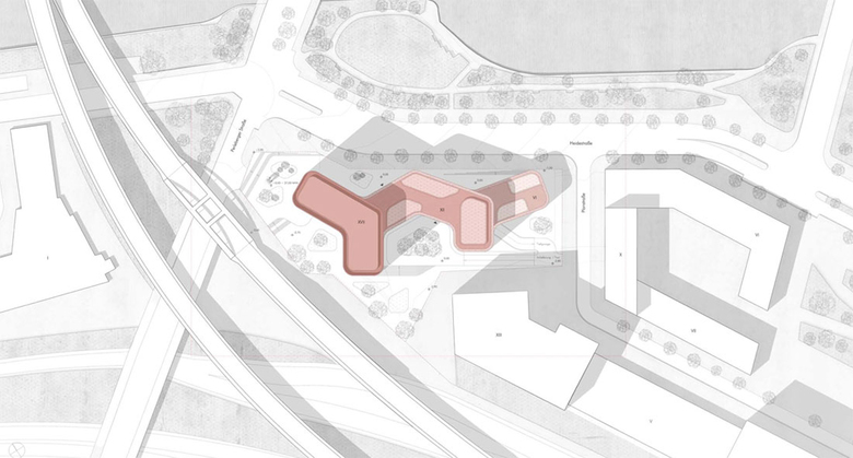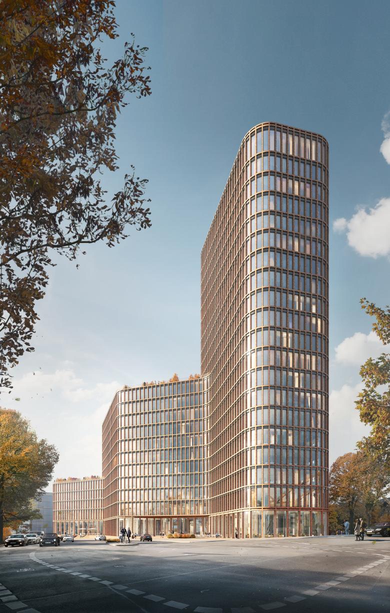 Mit dem neuen Gebäude sollen neben dem Repräsentationsanspruch des künftigen Nutzers auch alle funktionalen Aspekte eines zeitgemäßen und dynamischen Bürogebäudes vollauf bedient werden. Durch den Entwurf eines monolithischen Baukörpers können maximale zusammenhängende Flächen von 1.000 m² bis zu 2.500 m² bei nur zwei Erschließungskernen eingerichtet werden, wodurch ein Höchstmaß an Flexibilität garantiert wird. Da es keine Rückseiten gibt – ein weiterer Vorzug der sternförmigen Volumina – entsteht ein dynamisches Gebäude, das sich von allen Seiten zeigen kann und attraktive Platzsituationen in Form von Innenhöfen bzw. Vorplätzen ausbildet, die den Eingang markieren und eine klare Adressbildung erlauben. Insgesamt entsteht das Bild eines kraftvollen Baukörpers, der sich trotz einer ruhigen, unaufgeregten und zeitlos-sachlichen Architektursprache als selbstbewusster Solitär nicht nur im städtischen Kontext behauptet, sondern auch Teil eines Ensembles bildet.