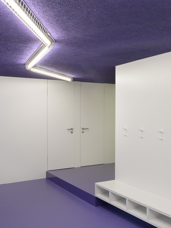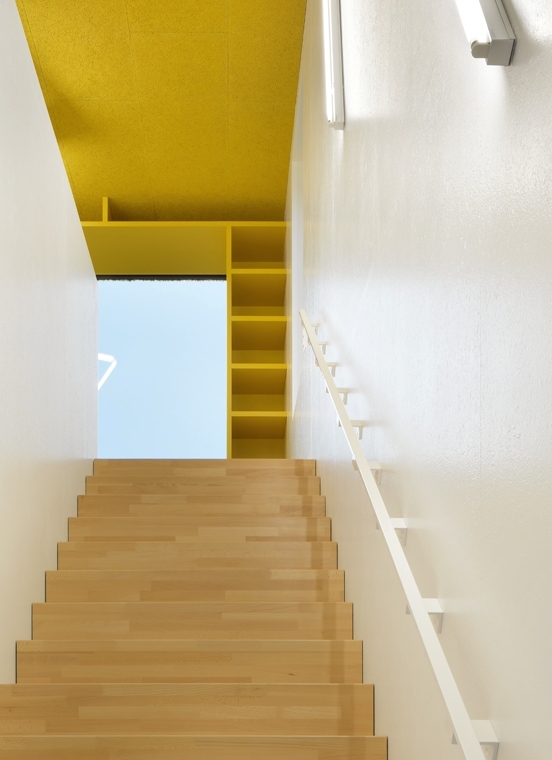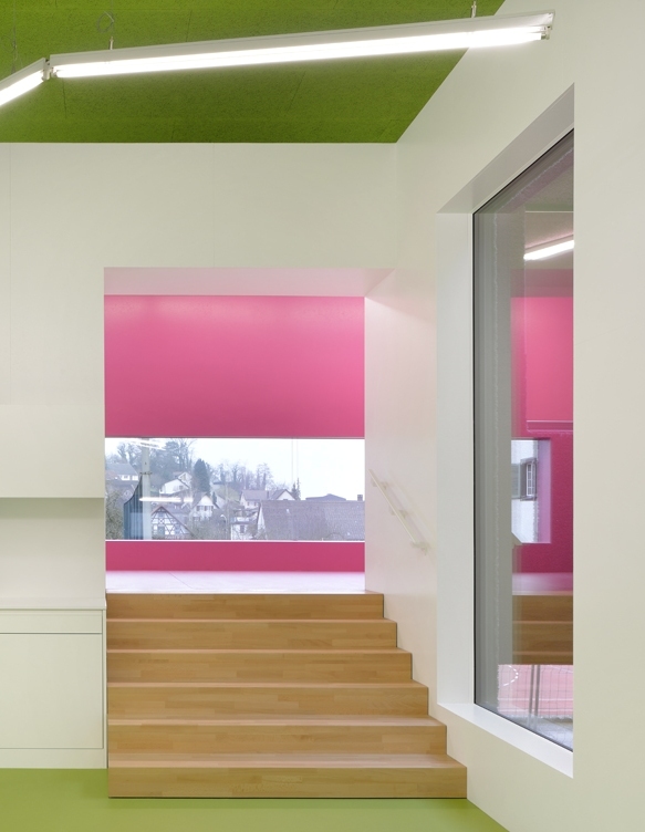 In einer fliessenden Abfolge durch verschiedene Baukörper reihen sich die Räume um ein zentrales Atrium: Eingang - Garderobe - Kindergartenraum - Spielecke - Material - und Gruppenraum. Die Raumabfolge steigt über kurze Treppenläufe sanft an und endet beim obersten Gruppenraum, der zugleich den darunter liegenden Eingangsbereich überdeckt. Eine Treppe führt zurück zum Entrée und schliesst so den Rundlauf.