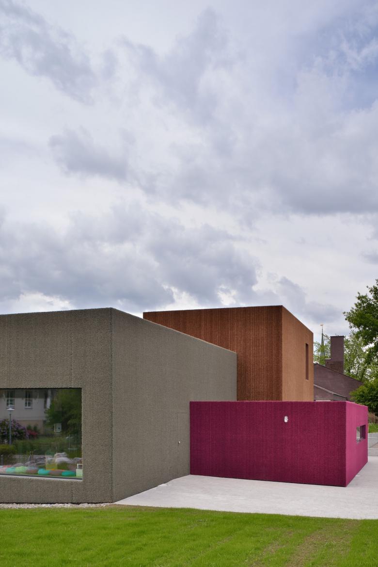 Eine kindgerechte, weiche Fassade aus Kunstrasenteppich fügt sich mit den Farbtönen Strohgold, Rotkraut und Olivgrün natürlich in die ländliche Dorfkernzone ein und animiert zum spielerischen Dialog.
