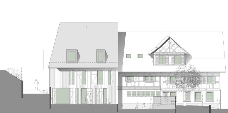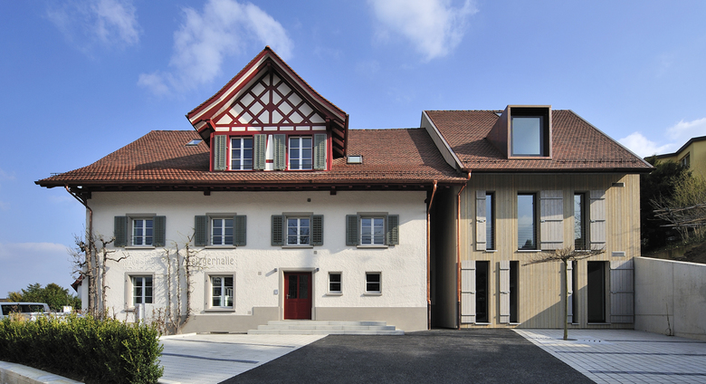 Das Projekt liegt in Dielsdorf im Zürcher Unterland. Das Gebäude war ursprünglich ein Restaurant mit Metzgerei und Schlachthof. Es ist heute noch bekannt als Restaurant zur Metzgerhalle. Im Haupthaus befanden sich das Restaurant mit Küche und die Zimmer für die Angestellten. Im alten westlichen Anbau befand sich der Schlachthof und südlich davon war das Metzgereigeschäft. Die Bauherren beauftragten die Architekten, dort attraktive Mietwohnungen zu realisieren. Zur Diskussion stand die Variante Abbruch der ca. 150-jährigen Liegenschaft mit der Planung eines kompletten Neubaus oder der Erhalt der Liegenschaft mit einem entsprechenden Erweiterungsbau. Aus dem Entwurfsprozess wurde bald klar, dass das Hauptgebäude auch im Hinblick auf das bestehende Ortsbild erhalten bleiben muss. Die Bausubstanz war jedoch so schlecht, dass das Haupthaus total saniert werden musste. Nur wenige historische Details und Bauteile konnten übernommen werden. Die jüngeren Anbauten wurden abgerissen. Durch den neuen kompakten Anbau wurde mehr Platz für die Außenräume geschaffen. Um an der stark befahrenen Straße großzügige Wohn-und Außenräume realisieren zu können, entschied man sich für Hofräume auf der südlichen Seite der Gebäude. Diese wurden in private und in gemeinschaftlich genutzte Höfe aufgeteilt. Die Gebäudeerweiterung sollte in Form und Material deutlich als Ergänzung zum Hauptgebäude erkennbar sein, ohne dazu in Konkurrenz zu treten. Alt und Neu präsentieren sich als Einheit. Damit wurde die Tradition der angebauten Wirtschaftsgebäude in zeitgemäßer Form weitergeführt.