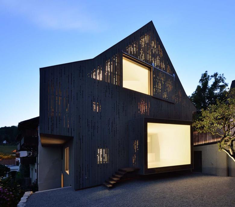 In der Fassade wird der Kontrast zwischen Alt und Neu klar aufgezeigt. Wie eine Haut legt sich die neue Fassade aus vorvergrauter Fichte um den Winkel der geschützten Fachwerkfassaden und zeichnet das historische Volumen des Gebäudes nach. Ein Kamin zur Lichtführung in das Dachgeschoss, ein auskragende Erker und Schiebetore interpretieren ortstypische Elemente neu und gliedern die Aussenhaut. Wie in der ländlichen Baukultur stark verbreitet wurde die halbtransparente Holzverschalung mit regionalen Ornamenten versehen, die in unregelmäßigen Verdichtungen ausgefräst wurden. Die neue Fassade löst sich auf in ein zartes Kleid, das dem Innen- und Aussenraum ein feinsinniges Licht- und Schattenspiel bietet.