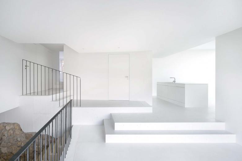 Die einzigartige Volumetrie der 3 Wohnungen entstand im Spannungsfeld zwischen zwei völlig verschiedenen Gebäudeseiten. Die Nordseite mit filigranem Fachwerk und Sprossenfenstern ist ein wertvoller Baustein des historischen Städtchens. Dem gegenüber steht die großzügige Südseite, die durch die Hanglage über ein zusätzliches Geschoss und einen atemberaubenden Weitblick verfügt. Inzwischen dieser Kontraste wurde ein dynamisches Spiel von Proportion, Licht und Materialisierung entwickelt. Kleine, allseitig in Holz verkleidete Kammern stiften eine sinnliche und geborgene Atmosphäre und schaffen einen starken Bezug zur Geschichte des Ortes. Um die Kammern mäandrieren weitläufige, allseitig weiße Räume, die durch großzügige Öffnungen das einzigartige Panorama nach innen bringen. Durch verschiedene Niveaus und Raumhöhen wird der Raumfluss zu einem dreidimensionalen Erlebnis mit immer wieder neuen Blickbezügen und Lichtsituationen.