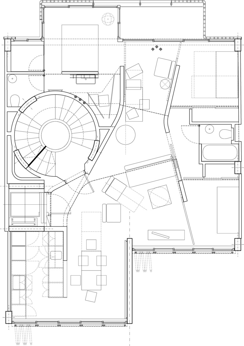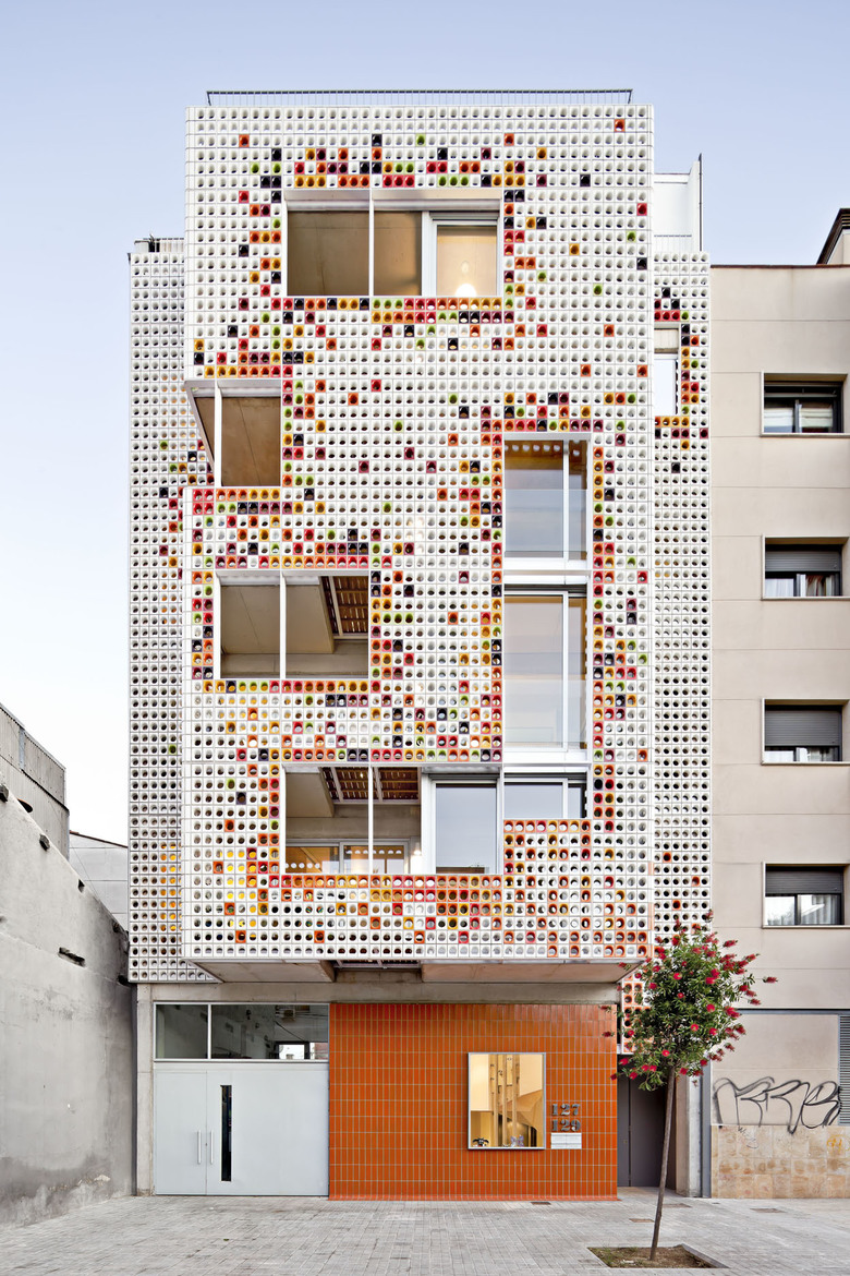 A volume created by the urban needs arising from the emergence of a new promenade, the change in section of the road. In a temporary space somewhere between what was and what is wanted. With all this, the building appears as an urban element at city level, responding to more than just the particular needs of the condominium complex. As a family-owned building, the program is organized with a local common space on ground floor and four levels of apartments, with direct access from the common elements. Thus, the building’s common areas and the spiral staircase are predisposed to sharing, away from the usual sterile neutrality and anti-vandalism character. The typology is compact, with windows on either side of the unit. The living room shapes the two walls and leaves along its sides the flexible enclosures that define the bedrooms and the bathrooms. The kitchen is open to the facade and the main hall. The roof has a special relationship with the city and the sea. Under a technical pergola is located a dining room which can be opened completely during the summer. Both facades have a high contrast design. The patio, very simple and to south-east with sea views has a ventilated ceramic facade with large openings for the winter and corrugated slatted blinds for the summer. The facade towards the street appears a bit happier, following the modernist tradition of the area. A ceramic lattice protects the west and gives privacy to the residences.