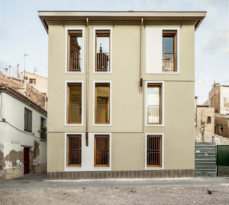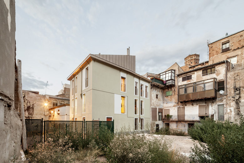 The design is carefully inserted into the urban fabric of the Tudela old quarter. This area is signified by the Jewish, Muslim and Christian footprints. Yet, the surroundings are defined by the massive condition derived from its medieval heritage. The narrow and tortuous streets are characterized by the texturized rendered walls and the wood galleries. The house merges into this both cultural and physical preexistence. The internal space takes place in between two façades. An external façade is defined as a part of the public space. Therefor it is conscious of the relation with the buildings nearby. And it carefully takes into account the public condition of the category. Its main elements are solid, stable. Just a few small gestures remind the quotidian use. As the handrail deformation, prepared to assemble the traditional flowers pots. The courtyard façade, and also we include the roof into this category, it is informal. And it reflects the everyday life dynamism. Its geometry is adaptive depending on the internal necessities. Stairs and courtyard are intertwined. The stairs landings are transformed into playing space, reading space or even workspace, facing the court. It is casual, alive as wood is. The building structure reflexes these two different moments. So, it is strict in the façade and adaptive to the courtyard. The use of the materials is rough, expressive, sincere. White terrazzo pavements, plaster walls, wooden plans and concrete roof slabs define the inner spaces. The sustainability strategy is based on the strong walls isolation and the effectiveness of the courtyard as a thermal regulator. Externally, the house aims being discreet but flirty, seduced by Sant Jorge Church, the Cathedral and the chip massive walls. Its interior twists and becomes alive with the magic mystery of a trapped maple tree. It dances, as we do, alone at home, while we are cooking, drinking and listening music.