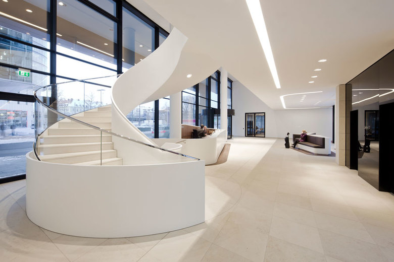 The implementation of the company philosophy in architectural corporate identity is reflected not only in the entrance lobby, the cafeteria, the conference areas, the auditorium, and the management areas, but also in the design of the workplaces. The new style emphasizes perfectly the company’s slogan – quality in everything we do. The open character of the building is enhanced by bright, elegant colors in the entrance hall. The use of wood, natural stone and Corian as a recurring design element produces a natural, warm atmosphere. The design concept runs through the entire object; even the elevators are lined with natural stone, and the façades of the entrance hall are adorned with it. As the dominant color, a strong Bordeaux red was chosen for carpets and leather coverings to provide a contrast to the partially illuminated white and the warm wood tones. The auditorium is one of the gems of this object, providing a successful symbiosis between the Corian as the enclosing casing for the interior and exterior and the use of warm wood and technical fabric wall covering for the interior. The library also deserves attention with its division into reception, reading, and lending areas. The cafeteria exudes a friendly, open character: both the choice of colors and the furniture invite visitors to linger.