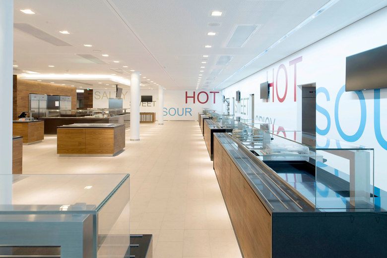 Das Free Flow Konzept ermöglicht einen frei begehbaren Speiseentnahmenbereich mit verschiedenen Ausgabestationen - von süß bis salzig, kalt und warm. Der Frontcooking Bereich un der Pizzaofen runden das vielfältige Angebot ab. Garderoben an allen Eingängen und Kartenaufwerter im Free Flow Bereich ergänzen die Infrastruktur.