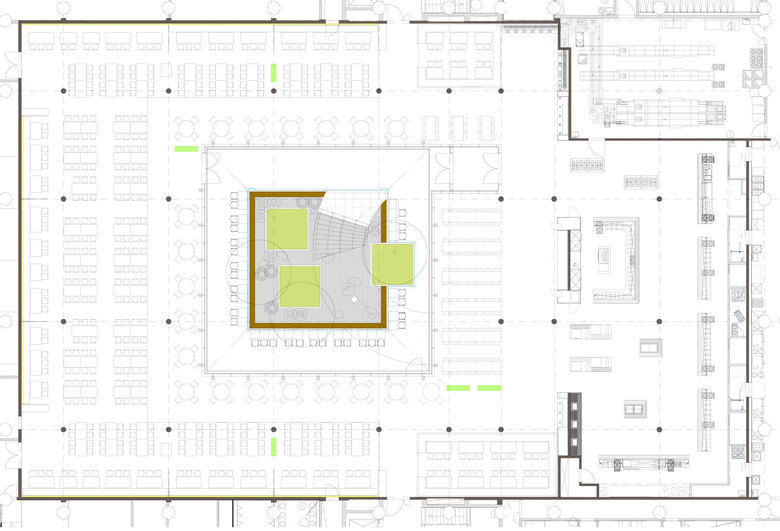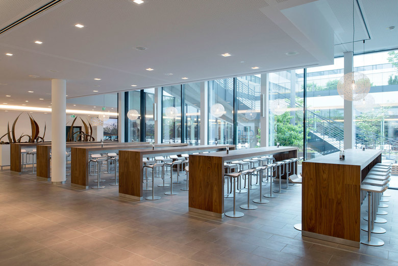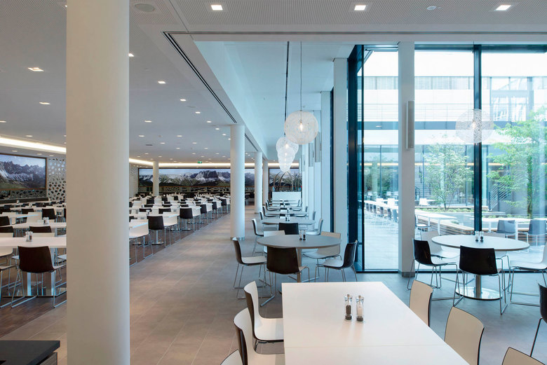 710 Sitzplätze im Innenraum und 60 Plätze im Innenhof verteilen sich über verschiedene Bereiche und ermöglichen unterschiedliche Aufenthaltsqualitäten für verschiedene Nutzungen. Entlang der Wände bieten durch weiße Raumteiler abgegrenzte Nischen eine Form von Privatheit, während die runden Sitzplätze an den Fensterflächen dem Motiv der italienischen Piazza angelehnt sind. Die zwei Oktoberfestboxen sind separat für kleinere Gruppen/ interne Veranstaltungen nutzbar. Entlang des Free Flow Bereichs runden Hochtische mit schlichten Barkhockern für spontane Besprechungen und Kaffeepausen das Raumangebot ab.