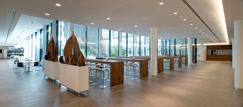 Der Bezug zwischen dem Innenraum des Restaurants und dem gestalteten Innenhof ist ein wichtiger Ansatz des Entwurfskonzepts. Die offene Fassade mit der großflächigen Verglasung ermöglicht den Einfall von Tageslicht und lässt die Besucher des Mitarbeiter Restaurants die verschiedenen Tagesstimmungen und saisonalen Unterschiede live miterleben.