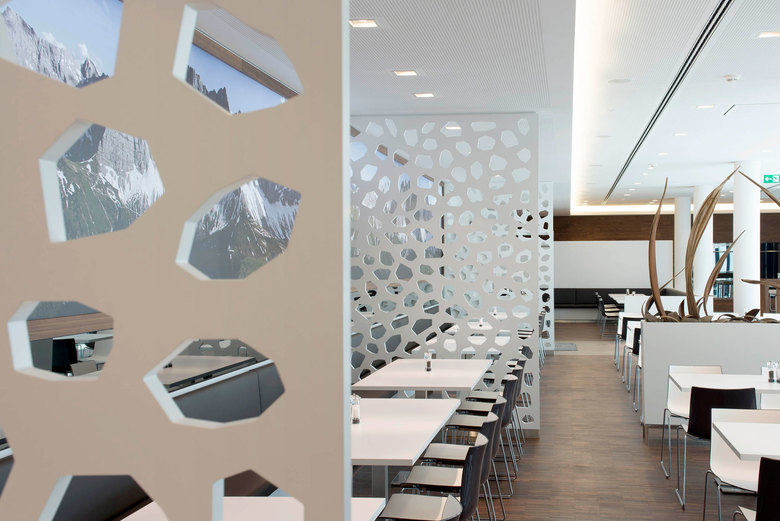 Die Farbwahl und Materialität der Gestaltung lehnt sich an das CI (Corporate Identity) von Rohde&Schwarz an. Die warmen Brauntöne des lebendigen Nußbaumholzes an Möbeln, Hochtischen und auf den Bodenflächen werden durch rückseitig lackierte Glasflächen, schwarzen Granitplatten aus Nero Assoluto und großflächige Bodenfliesen ergänzt. Die weiß lackierten Flächen der Raumteiler und die weiß beschichteten Tische mit den schlichten weiß-braunen Stühlen und Barhockern sowie die farblich passenden Lederflächen auf den Sitzbänken bilden den notwendigen Kontrast. Ein Highlight sind die umlaufenden Leuchtkästen an den Rückwänden, deren alpines Motiv als Ergebnis der Mitarbeiterbefragung hervorgegangen ist.