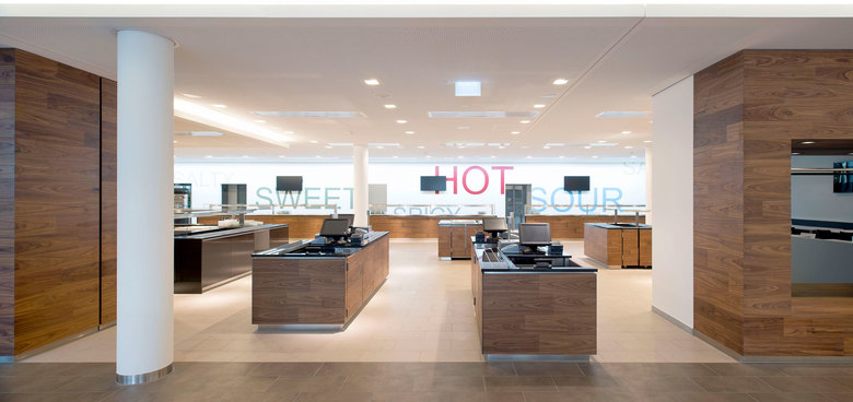 Das neue Mitarbeiterrestaurant befindet sich im Tiefhof/1. Untergeschoss des Neubaus MÜ15 auf dem Rohde & Schwarz Campus mit einem umlaufenden Speisesaal mit Free Flow Bereich und dem separaten Küchentrakt.