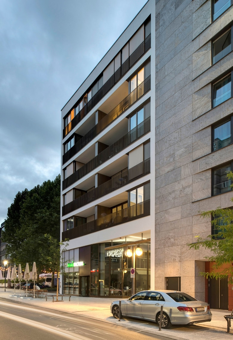 Dort wo sich lange Jahre der Glaspavillon des ersten Magazin-Ladens befand, entstanden auf sieben Ebenen erneut Flächen für Einzelhandel (Magazin, Manufactum und Brot & Butter) sowie hochwertige Wohnungen. Die Erschließung der Wohnungen erfolgt über die Passage mit Zugang im Rückgebäude. Das 1. Obergeschoss fungiert als Verteiler und erschließt über den schon im Bebauungsplan als Grünraum festgeschrieben Innenhof das Vordergebäude. Pro Etage werden zwei Wohnungen erschlossen, die zu beiden Seiten ausgerichtet unterschiedliche Ausblicke und Raumqualitäten bieten. Die räumliche Organisation des Gebäudes ermöglicht die Ausbildung von zwei unterschiedlichen Penthouses mit Blick über die Stadt.