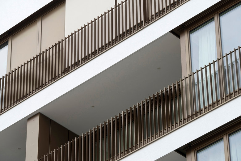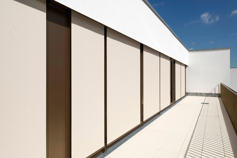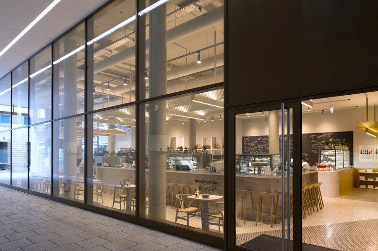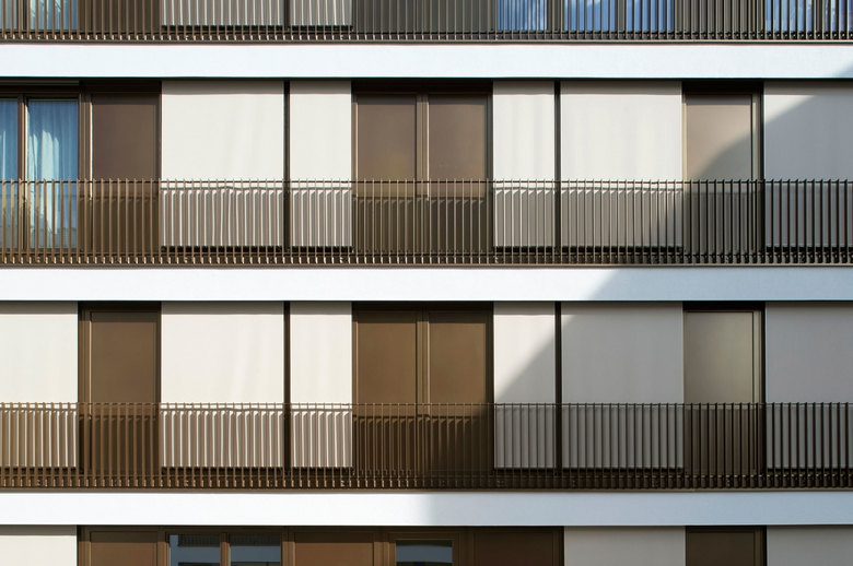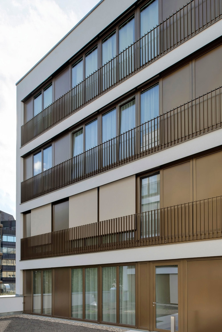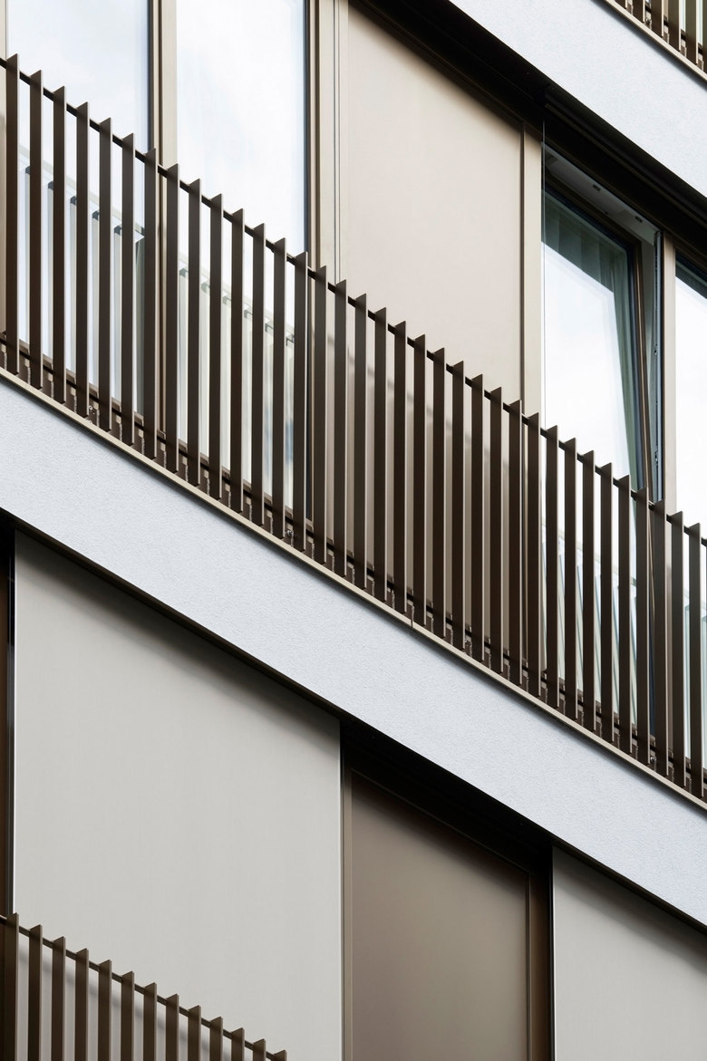 Die Fassade gliedert sich in die geschosshohe Glasfront des Ladengeschäfts als überhöhten Sockel und eine klassische Bandfassade für die Wohnebenen. Raumhohe Öffnungselemente in Kombination mit geschlossenen Metallpaneelen prägen das äußere Erscheinungsbild des Gebäudes. Die durchgehenden Fensterbänder erlauben die gewünschte Flexibilität für die Aufteilung der Wohnräume. Die klare Farbpalette aus weißem Putz, bronzefarbenen Paneelen und Fensterrahmen sowie dem farblich abgestimmten textilen Sonnenschutz unterstützen die reduzierte Architektur der Bebauung.