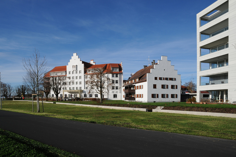 Das gesamte Areal war ursprünglich eine denkmalgeschützte Bundesheerkaserne aus den 40er Jahren. Ein kleiner Trakt durfte abgebrochen werden. Der Rest wurde saniert und umgenutzt und durch zwei Neubauten flankiert.
