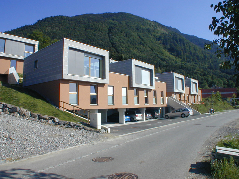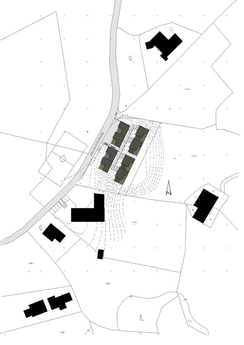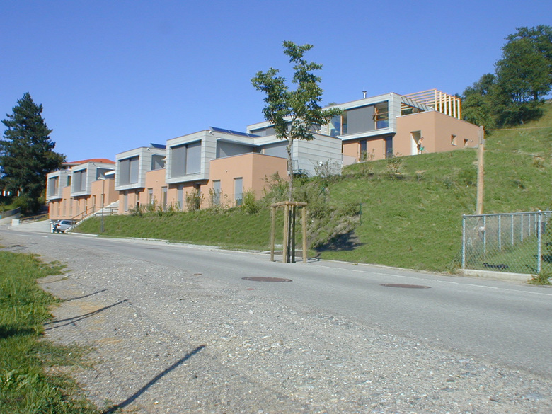 Die Bebauung ist in zwei Baukörper gegliedert, die dem Gelände und der Straße folgen. Jedem Baukörper ist ein Grünraum oder eine Erschließungsfläche vorgelagert, die gleich breit ist wie der Baukörper.