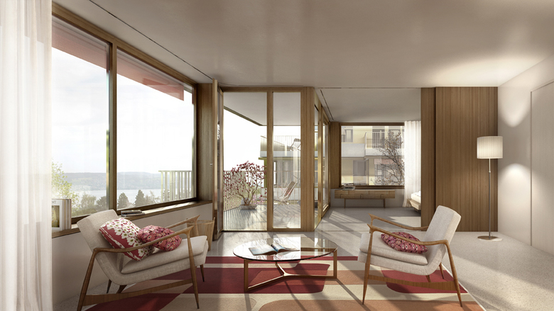 Eine typische Lagequalität am linken Ufer des Zürichsees ist die Divergenz zwischen dem talseitigen Seepanorama gegen Osten und Norden und der vorwiegenden Besonnung aus südlicher und westlicher Richtung. Alle Himmelsrichtungen weisen damit hohe, aber unterschiedliche Qualitäten auf, die sich in der Organisation der Grundrisse nutzen lassen.