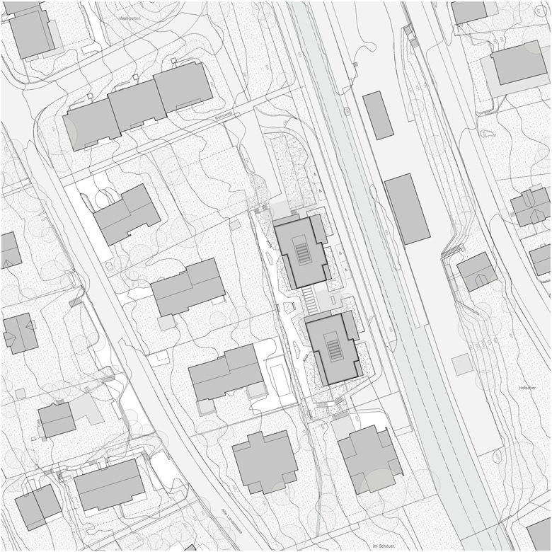 Die beiden vorgeschlagenen Volumen stehen zur Weingartenstrasse gestaffelt und leicht abgedreht gegen Süden, damit die Ein- und Aussicht wie auch die Besonnung optimal genutzt werden kann. Die Brechung der Frontalität zu den Bahngeleisen ist dabei beabsichtigt; auch wenn dieser technische Effekt nur einen kleinen Beitrag zum Schallschutz leisten wird.