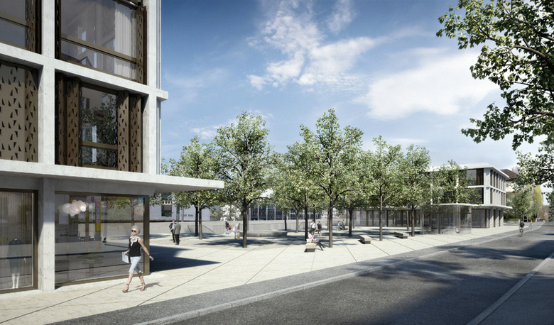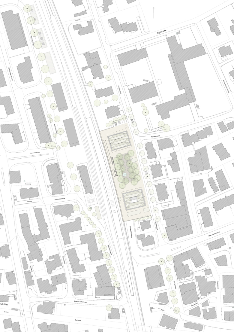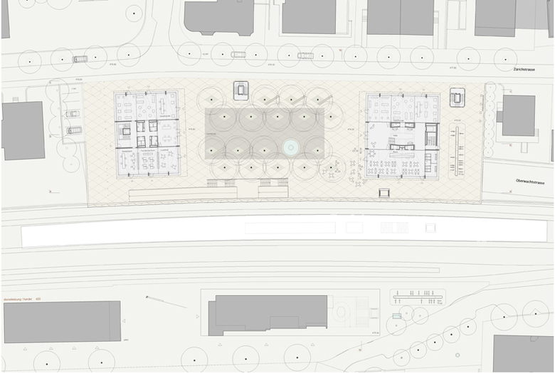 Das neue Zentrum in Küsnacht wird ein Ort des Geschehens; ein urbanes Feld im dörflichen Massstab, das sich als öffentlicher Platz zwischen der Zürichstrasse und dem tiefer liegenden Bahnhof etabliert. Die Verfassenden verfolgen einen klassischen Ansatz von Platzraumgestaltung, bei dem einerseits die Gebäudereihe der Zürichstrasse den Aussenraum begrenzt und andererseits die beiden neu gesetzten Volumen je eine Platzfassade bilden. Dieser Aussenraum öffnet sich als erhobene und unterbaute Terrasse gegen Westen mit breiter Sicht auf See und Berge.