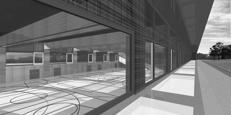 Die städtebauliche Setzung des neuen Baukörpers begründet gleichzeitig ein neues äusseres Zirkulationssystem innerhalb der Kantonsschule Rychenberg. Entlang diesem campusartigen Anlagenparcour um die Leichtathletikanlage bietet das neue Schulgebäude unabhängige Zugänge zum Sporttrakt, zur Mediothek und Musik, zur Klassenzimmer-Erweiterung sowie zum Parkhaus für Velos und motorisierten Verkehr. Die Zugänge zu den Hauptnutzungen sind unmittelbar über das Erdgeschoss erreichbar.