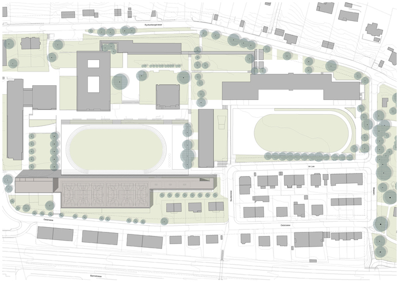 Der Eingriff fasst über die gesamte Länge die gegen Süden ausufernden Teile der Schulanlage Rychenberg zusammen. Mit der gleichzeitigen Bereinigung und Präzisierung der Hangkante südlich der Lanter-Anlage wird ein inneres Feld geschaffen, das die geometrisierten Spiel- und Sportfelder aufnimmt.