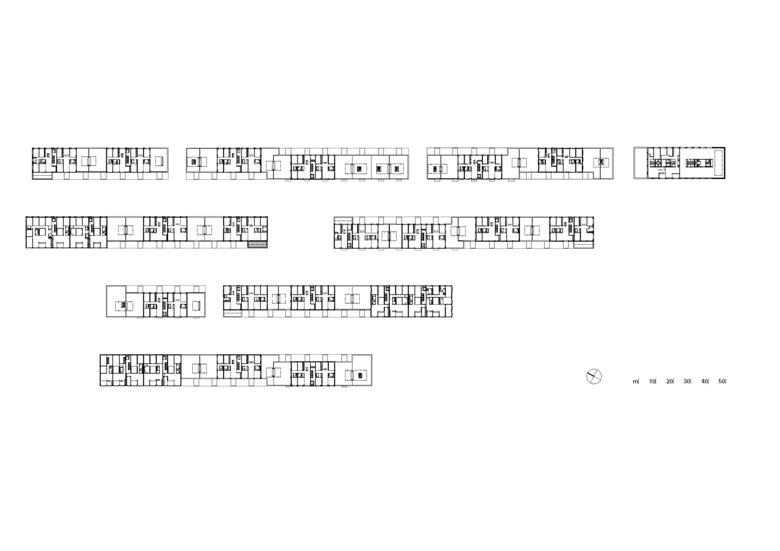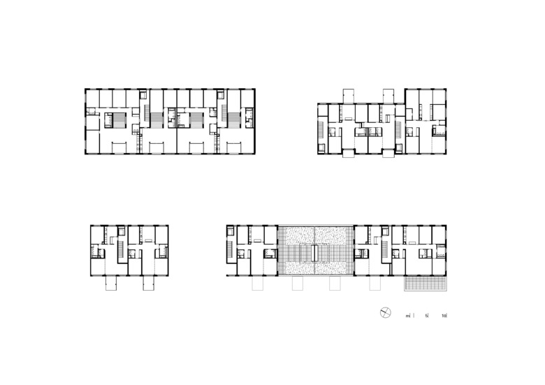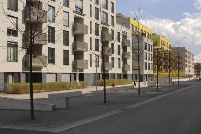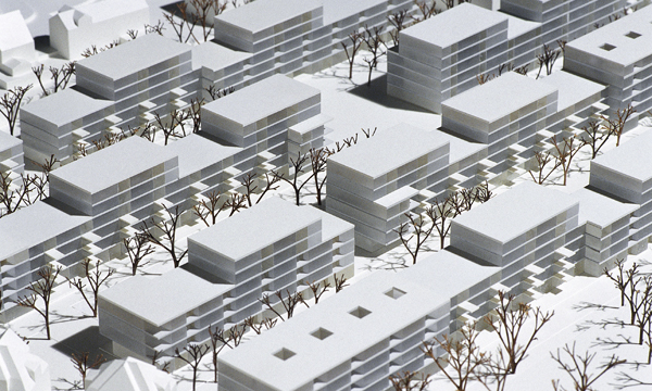 These linear elements serve as a footprint from which nine individual buildings meander - eight 4- to 6-story structures and one 4- to 14-story high-rise. The horizontal and vertical movement of the building volumes creates a balance between intimate and open spaces, between individual and collective areas and between a rural atmosphere and an urban setting.