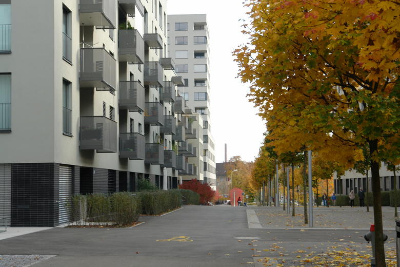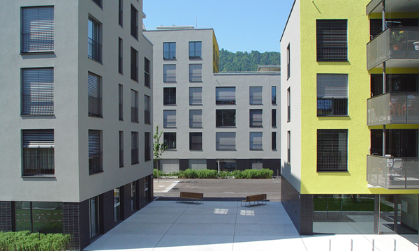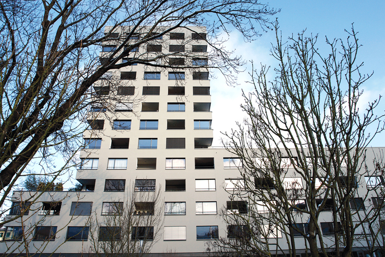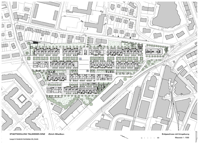 The building complex, Binzallee, is located at the foot of the Uetliberg mountain range in the up-and-coming, „south-end“ section of Zurich. The triangular site is on the urban periphery; bordered by industrial buildings and a local train line to the west, small multi-family houses to the east and a large apartment complex to the north.