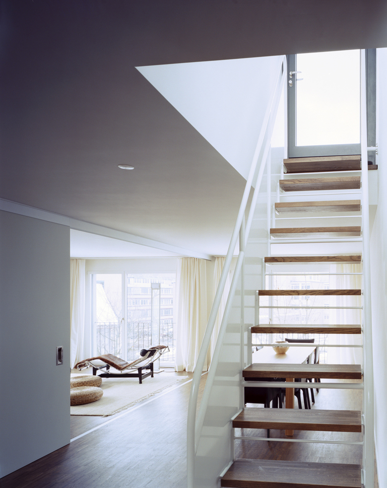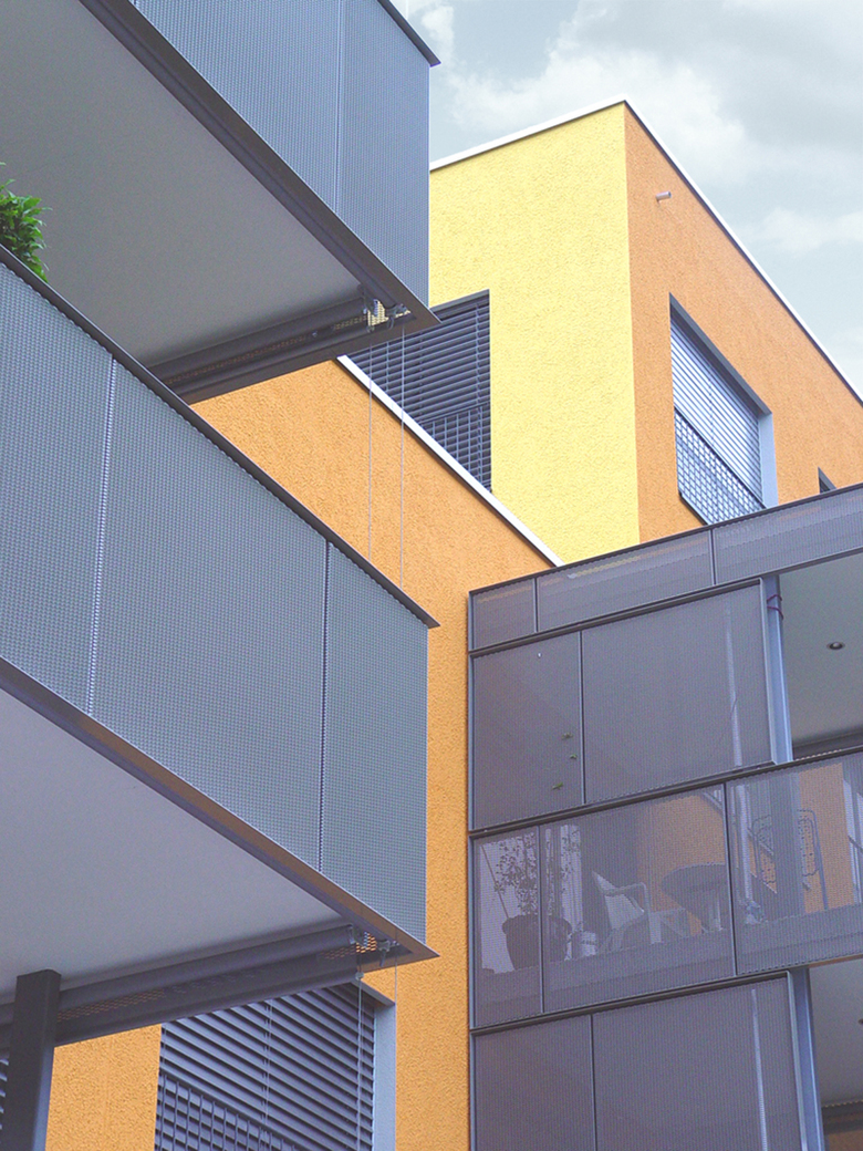 Sliding walls create flexible spaces and allow various forms of living and furnishing options. Each apartment has one or two balconies or a garden-room. The upper units enjoy large roof terraces.