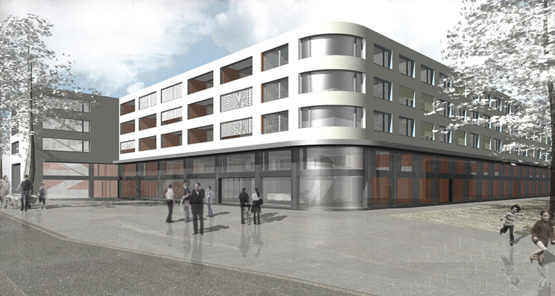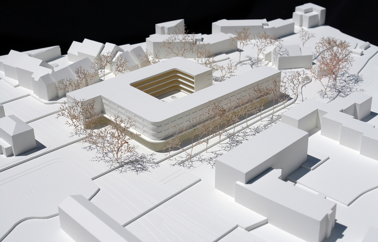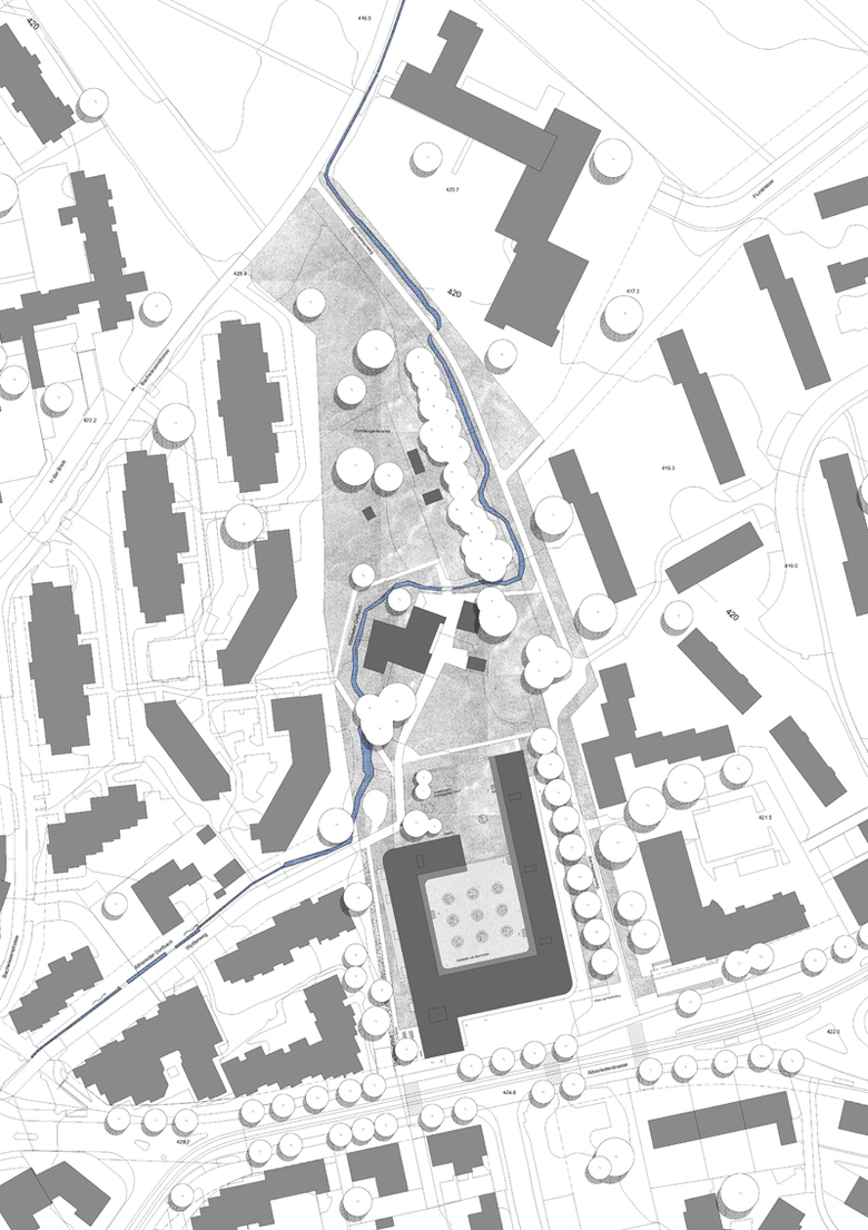 Ein aufgeschnürter Hofrand mit zwei freien Armen verankert sich städtebaulich an der Baulinie entlang der Albisriederstrasse und entwickelt sich nach Norden. Die beiden freien Enden öffnen sich asymmetrisch, um mit dem Umfeld der alten Mühle einen übergreifenden Freiraum zu bilden, der sich als Freihaltezone bis weit in den Norden erstreckt. Die ganze Gebäudeanlage versteht sich damit auch als Termination des Freiraumgürtels gegenüber dem neuen Zentrum in Albisrieden.