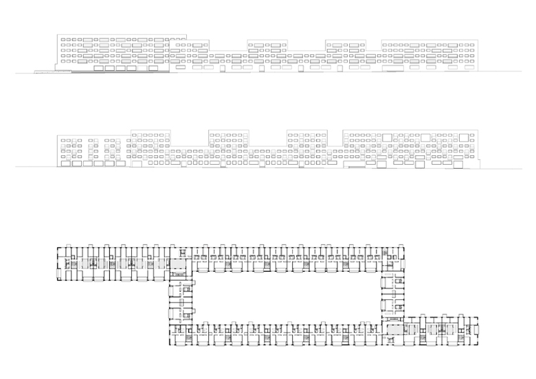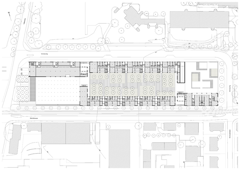 Für die Aufwertung der Grünau wird eine Gebäudeanlage entwickelt, die sowohl die hohen Anforderungen in das eigene Wohnumfeld erfüllen will als auch eine städtebauliche Brücke zwischen den losen Teilen des Quartiers zu bilden vermag. Die vorgeschlagene Grossform ist die urbane Antwort auf die bestehenden Hochhäuser und die grossmassstäbliche Gebäudeanlage der Tüffenwies. Dabei bildet der Zusammenbau die Kulisse für die angestrebte städtebauliche Dichte. Der Plot der Gebäudeanlage generiert einen Wohnhof und zwei öffentliche Plätze unterschiedlichen Charakters. Alle drei Aussenräume leisten ihren spezifischen Teil zur Aufwertung des Ortes.