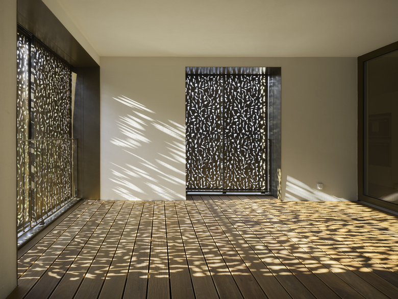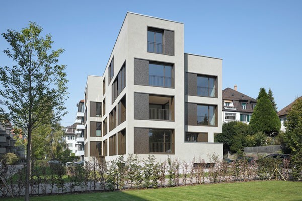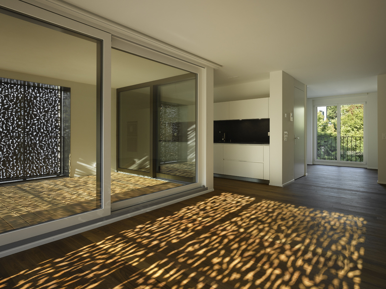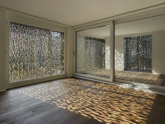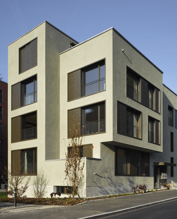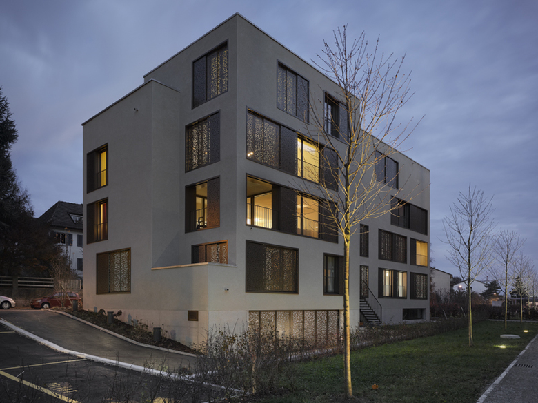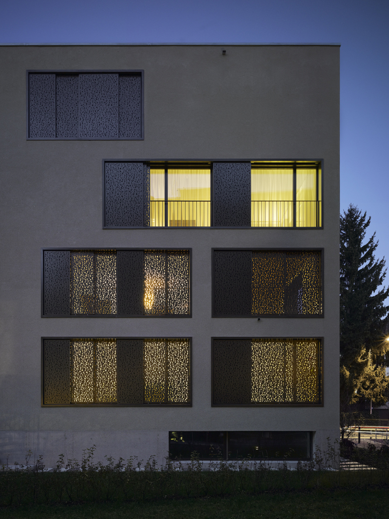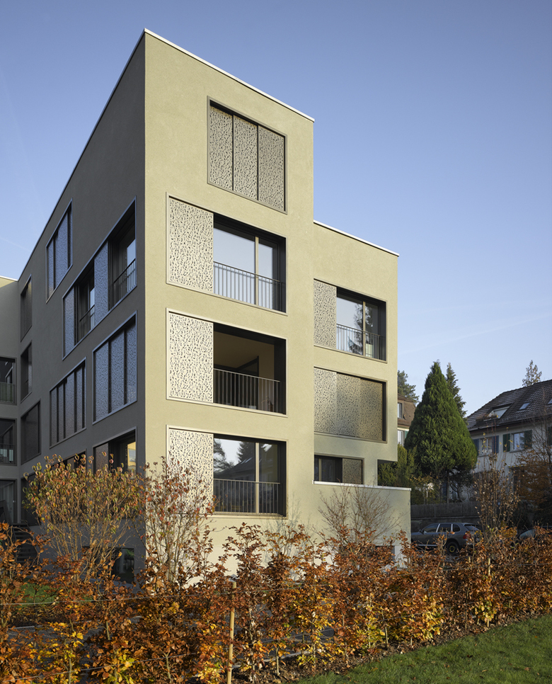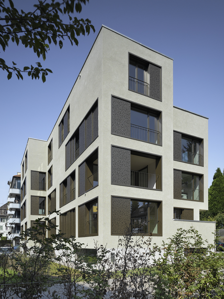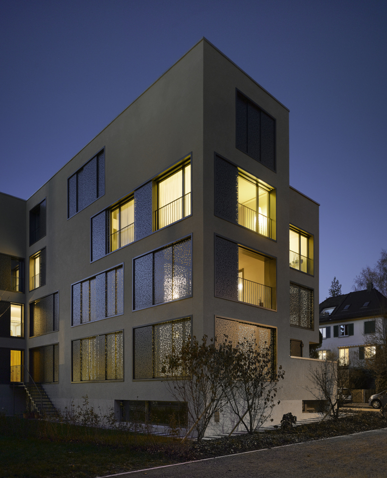 Located on a small parcel of land in the city of Zürich, this multifamily house mediates between the various building heights of the existing urban context. Since the site was originally intended to be an open green space for the adjacent housing development, the new building was conceived as a garden pavilion. The cubist form with a porous stucco facade and large window openings oscillates between structure and mass. Deep frames with sliding shutters shift and transform the proportions of the facade openings, adding dynamic to the structure. Metal panels, perforated with an abstract floral pattern, provide sun protection while controlling views into and out of the living spaces. The building volume encompasses six living units –