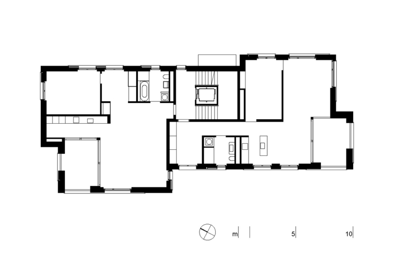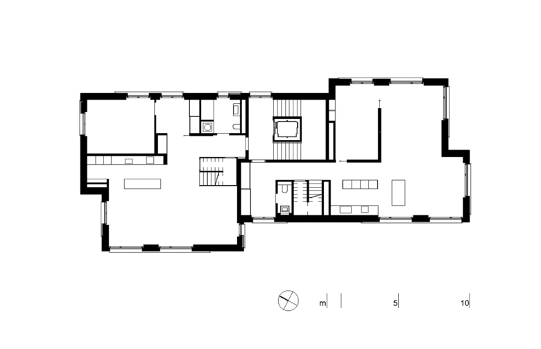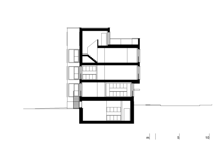 a 5-bedroom unit with garden access on the ground floor, two 1-bedroom units with loggias on the first floor and two 3-bedroom duplex units with roof terraces on the top floors. A 9-foot high atelier studio space is integrated into the slope of the site.