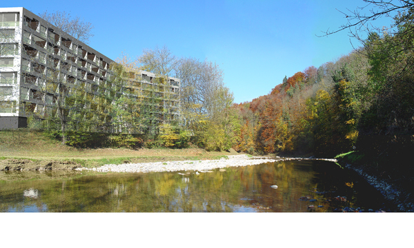 Die Grossvolumen auf dem Schwemmland schreiben eine städtebauliche Struktur weiter, die sich im benachbarten Industriegebiet Manegg längst etabliert hat. Diese Fortführung in aufgelöster Form versteht sich aber gleichzeitig als Abschluss dieser Grossmassstäblichkeit, da mit der Talenge beim Bahnhof Leimbach die Stadt verlassen wird.