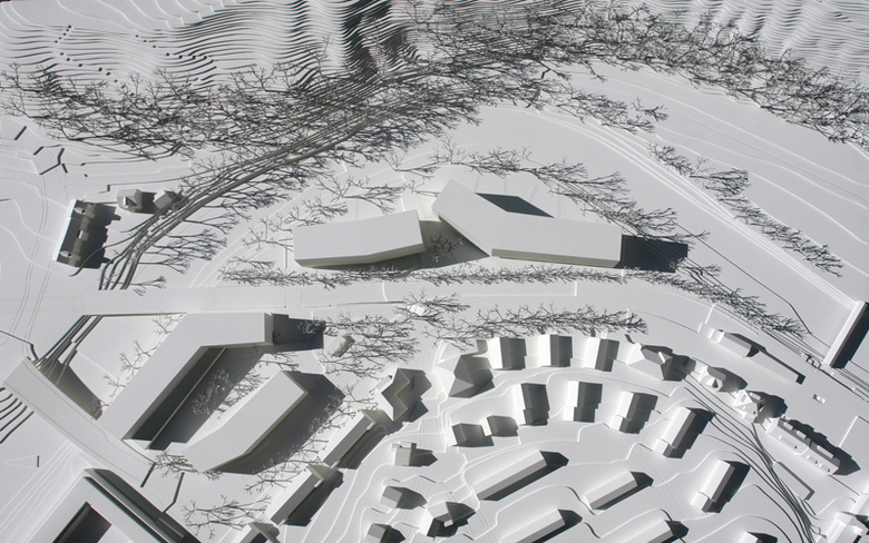Die beiden Baukörper auf dem Areal A schmiegen sich rückwärts an die Bebauungsgrenzen und spielen in der Folge einen polygonalen länglichen Marktplatz frei, der sich selbst gegen Süden leicht öffnet. Übergreifend mit der Verkehr umflossenen Bauminsel wird ein Stadtraum gebildet, der mit den beiden Wohnbauten auf dem Areal B seinen räumlichen Abschluss findet.