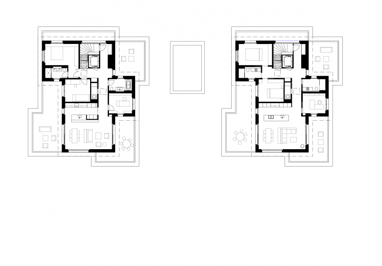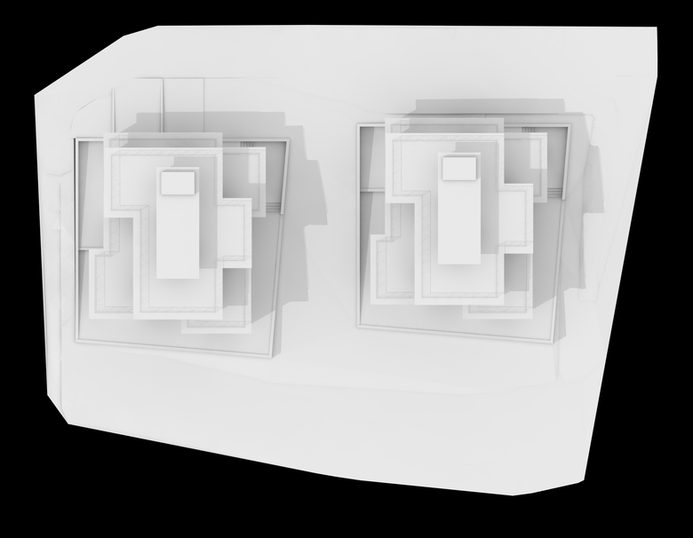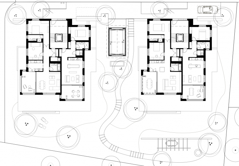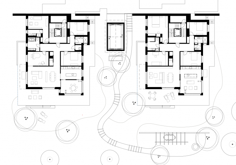 Die beiden Zwillingsbauten stehen auf diesem Kellersockel und durchdringen sich im Bereich des Erschliessungskern mit den hangseitig gelegenen Nebenräumen.