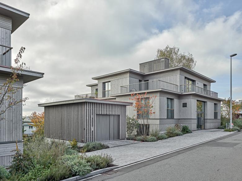 Mit einem eingehausten Autoaufzug zwischen den Wohnhäusern konnte die beträchtliche Niveaudifferenz zwischen Hubstrasse und Einstellhalle ohne Einschnitte im Gelände - und damit verbunden - auch eine unnötige Bodenversiegelung vermieden werden.